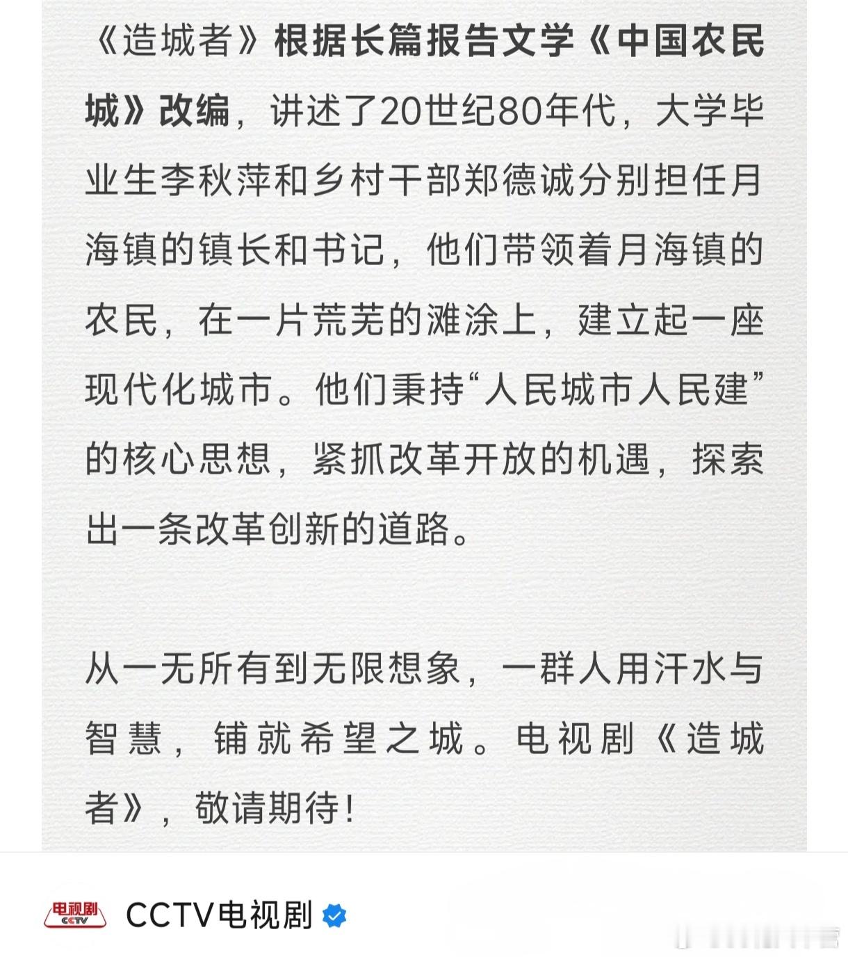 CCTV电视剧官微推荐——《造城者》根据长篇报告文学《中国农民城》改编,讲述了20世纪80年代,大学毕业生李秋萍和乡村干部郑德诚分别担任月海镇的镇长和书记,他们带领着月海镇的农民,在一片荒芜的滩涂上,建立起一座现代化城市。他们秉持“人民城市人民建”的核心思想,紧抓改革开放的机遇,探索出一条改革创新的道路。