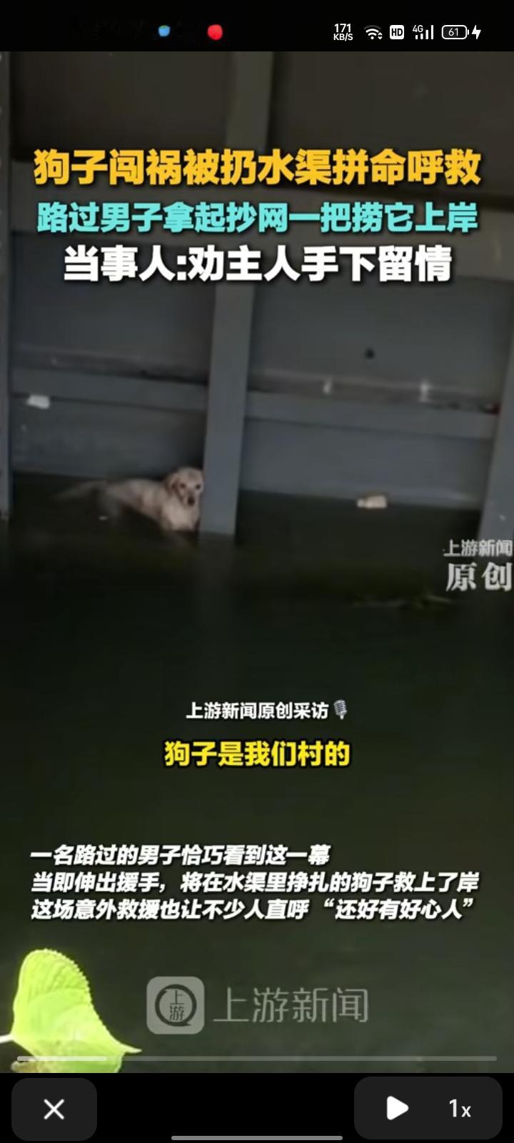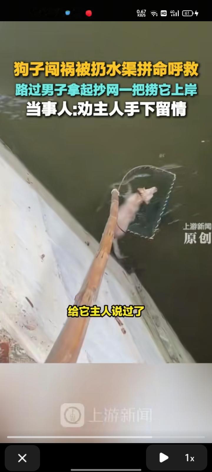 10月8日,黄冈市蕲春县。网友发视频称,狗子因咬死鸡惹祸,被主人一气之下丢进水渠,在水中无助叫了半天。随后,自己找来抄网把狗子捞起来了,劝狗主人手下留情,后续狗子被主人的亲戚收养。