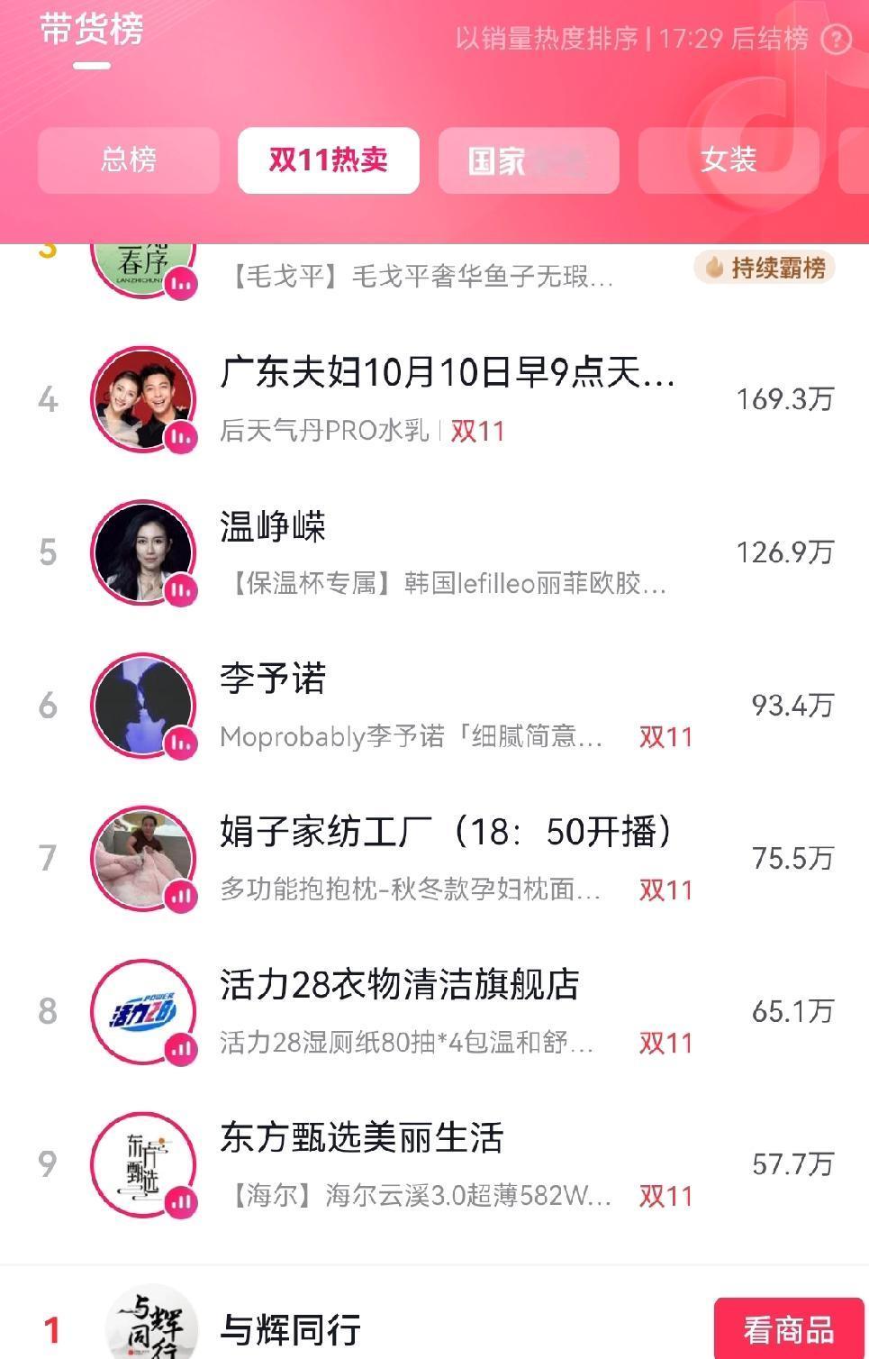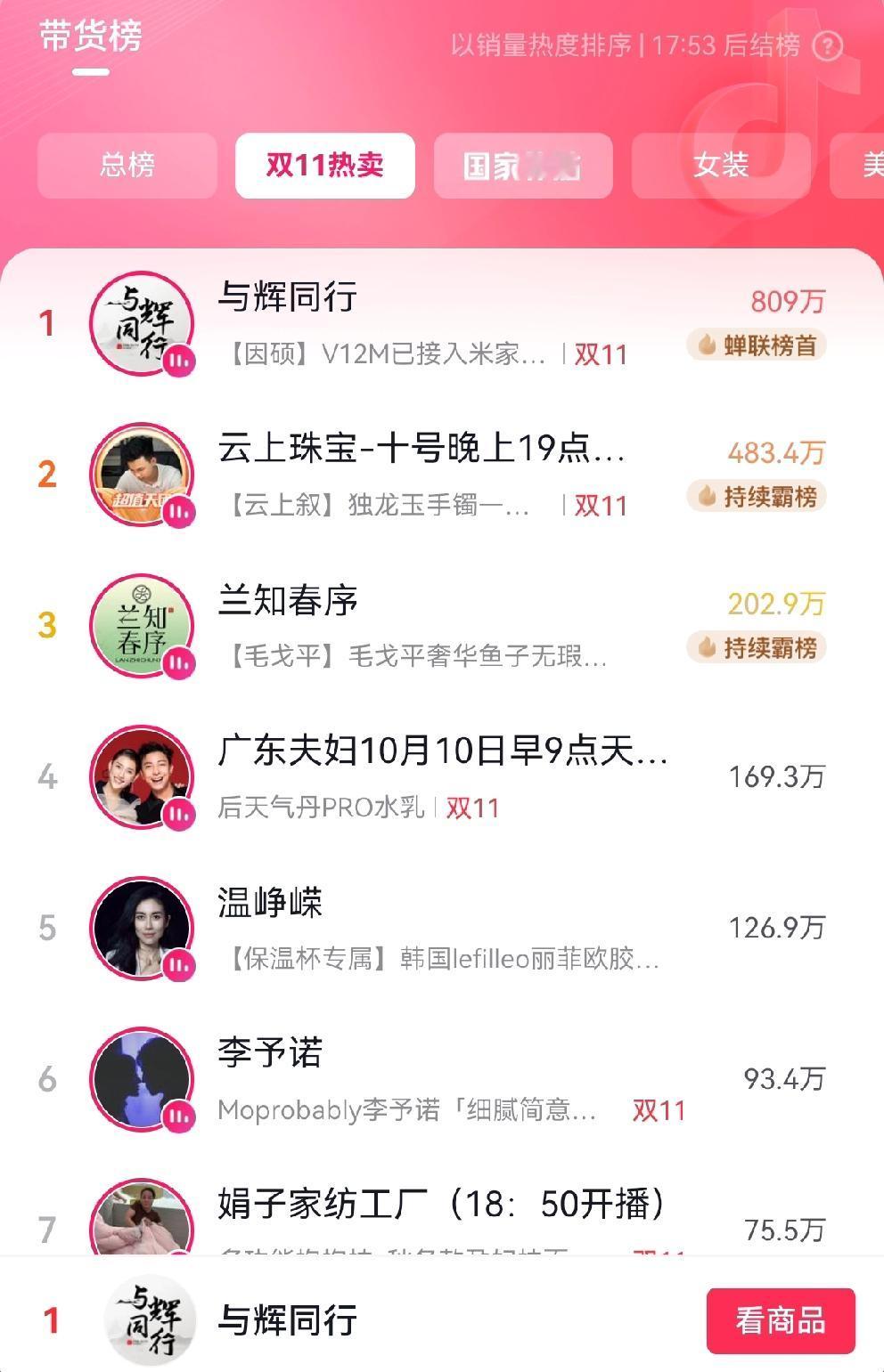 董宇辉老师,您搞这么多账号让老东家什么活? 双11大战,各路豪强各出绝招,今晚上七点同黄金时段,与辉同行和兰知春序分别排第一和第三,人气一个809.一个202,加起来1010之多,老东家排第九,可人气只有57,只有董宇辉的5.6%,这个差距大得太离谱了,老东家难道不投流了? 遥想当年意气风发,现却日渐凋零,时也运也,流量这东西不随人意志所想,强者通吃,按规划却往往差强人意,老板的执着却不能体现到结果,有钱没有粉丝喜欢一切成空谈,董宇辉现在这么强,要是开5个帐号,前10可能就会占5个名额。建议董宇辉老师还是适当收敛,给别人也有一点空间,独乐乐不如众乐乐,毕竟老东家也有这么多员工要养? 兰之春序,盼盼当家,她自己都没想到会有今天,有时一个选择就比才华更重要,盼盼一看就是旺夫命好之人!大家认为呢?哈哈!董宇辉带货技巧 董宇辉常识