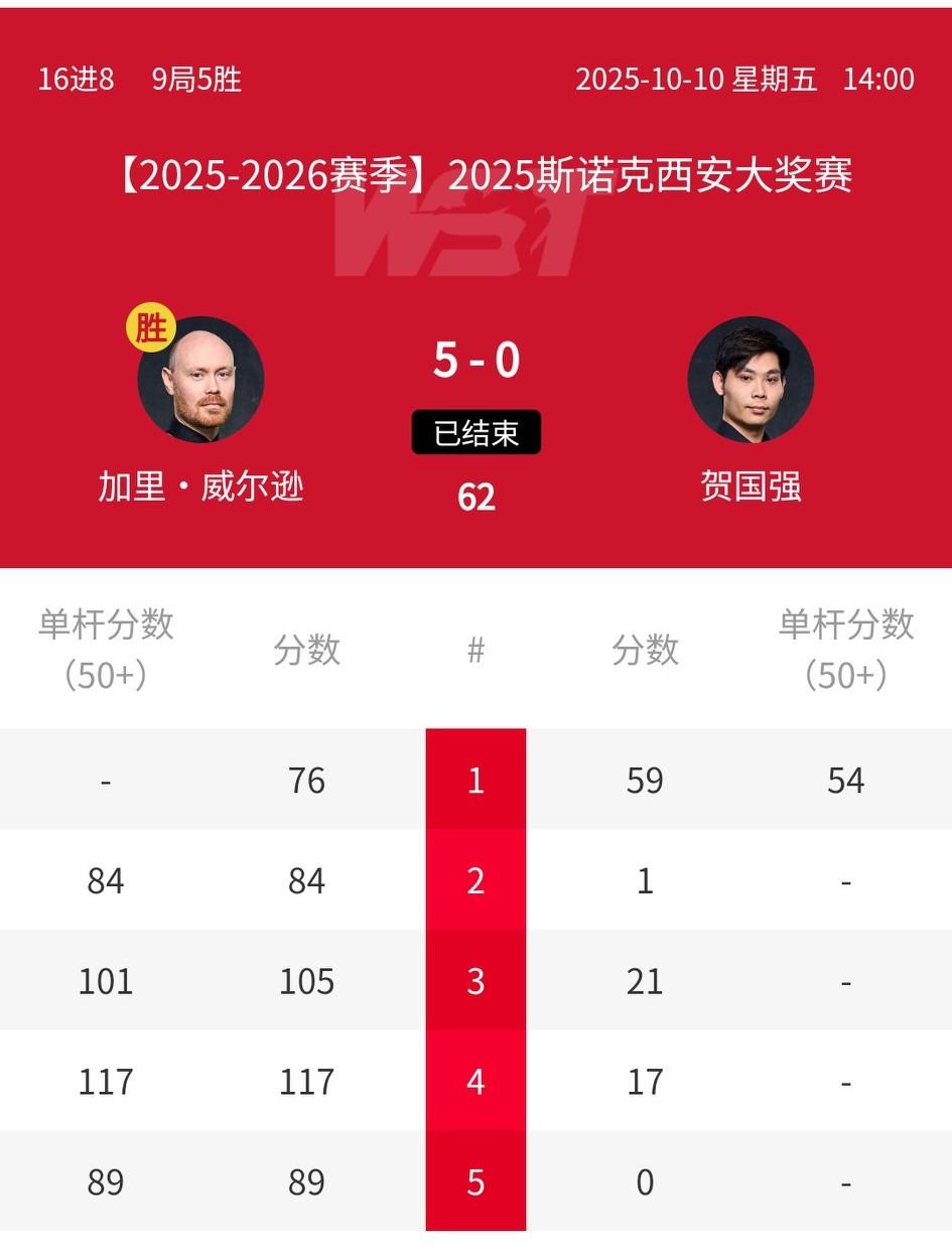 随着塞特赵出局,囧哥也出局了,是以一种非常惊艳的方式出局。2025斯诺克西安大奖赛八强已出4席,国强被淘汰。 墨菲5-0凯伦威尔逊 加里威尔逊5-0国强 利亚姆·普伦5-1亚伦·希尔 丹尼尔·威尔斯5-2米尔金斯