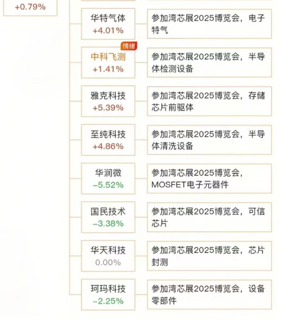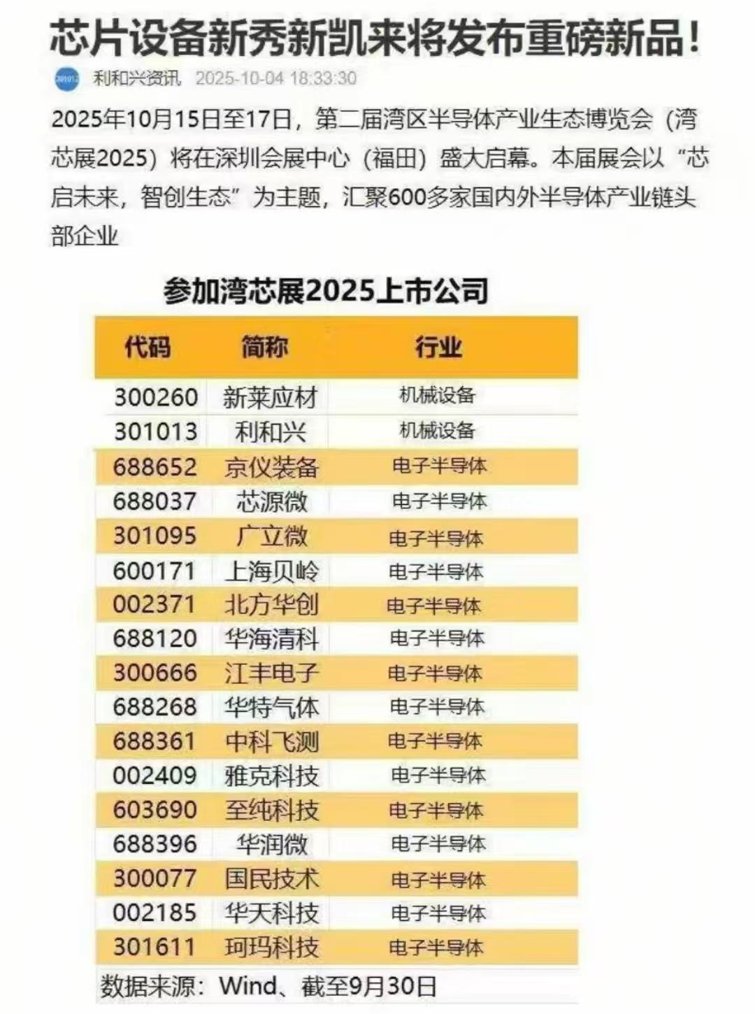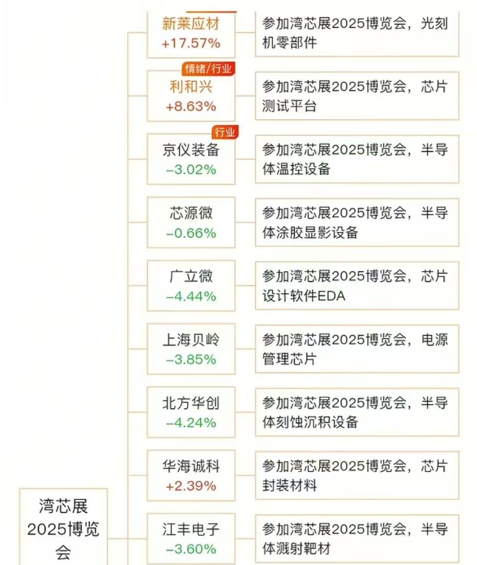 湾芯展2025博览会参会公司名单 10月10日最新消息,2025湾区半导体产业生态博览会(简称“湾芯展”)将于10月15日至17日在深圳会展中心举行。 展览吸引了来自全球20多个国家超600家龙头骨干企业及知名院校机构参展。芯展会重要参会上市公司代表:新莱应材、利和兴、至纯科技、雅克科技等等。 据10月10日“2025湾区半导体产业生态博览会”新闻发布会消息,新凯来将携最新半导体设备亮相在湾芯展。新凯来是国产半导体设备领域的“国家队”核心玩家,与其高度关联的上市公司有新莱应材、深振业、奥普光电、波长光电等等。 理财有风险入市需谨慎!