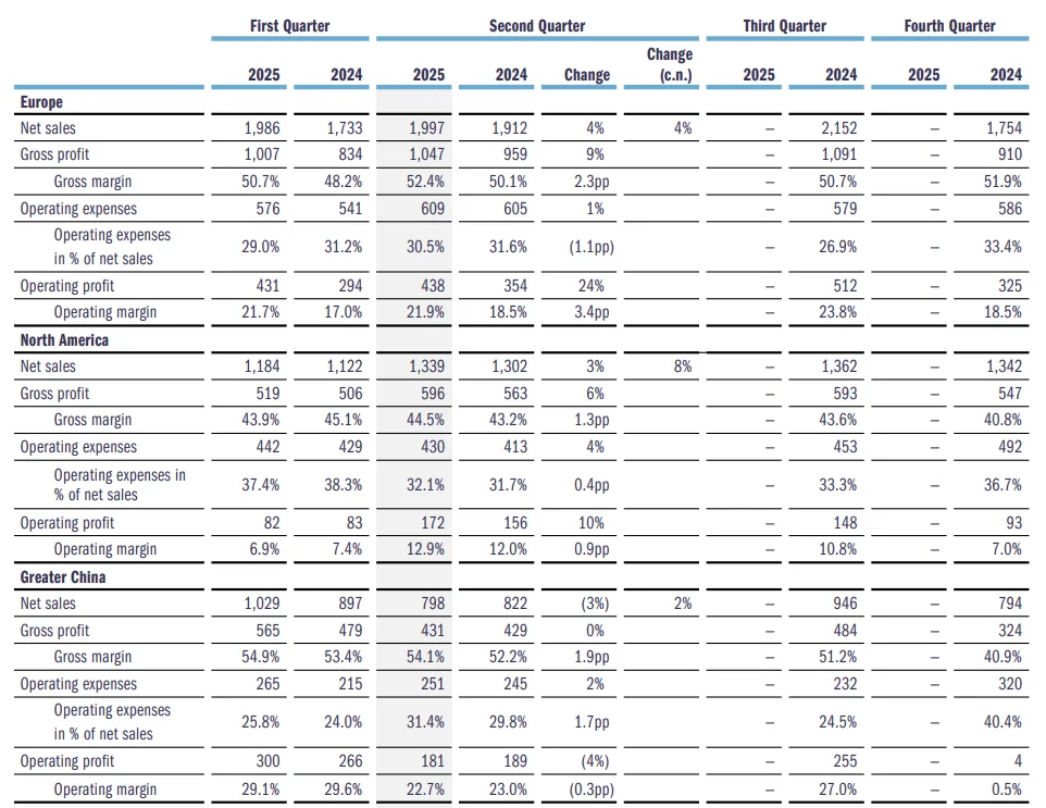 大中华市场继续低迷,期内销售下滑3%至7.98亿欧元,固定汇率增幅2%,继续大幅跑输集团整体8%的增长表现。