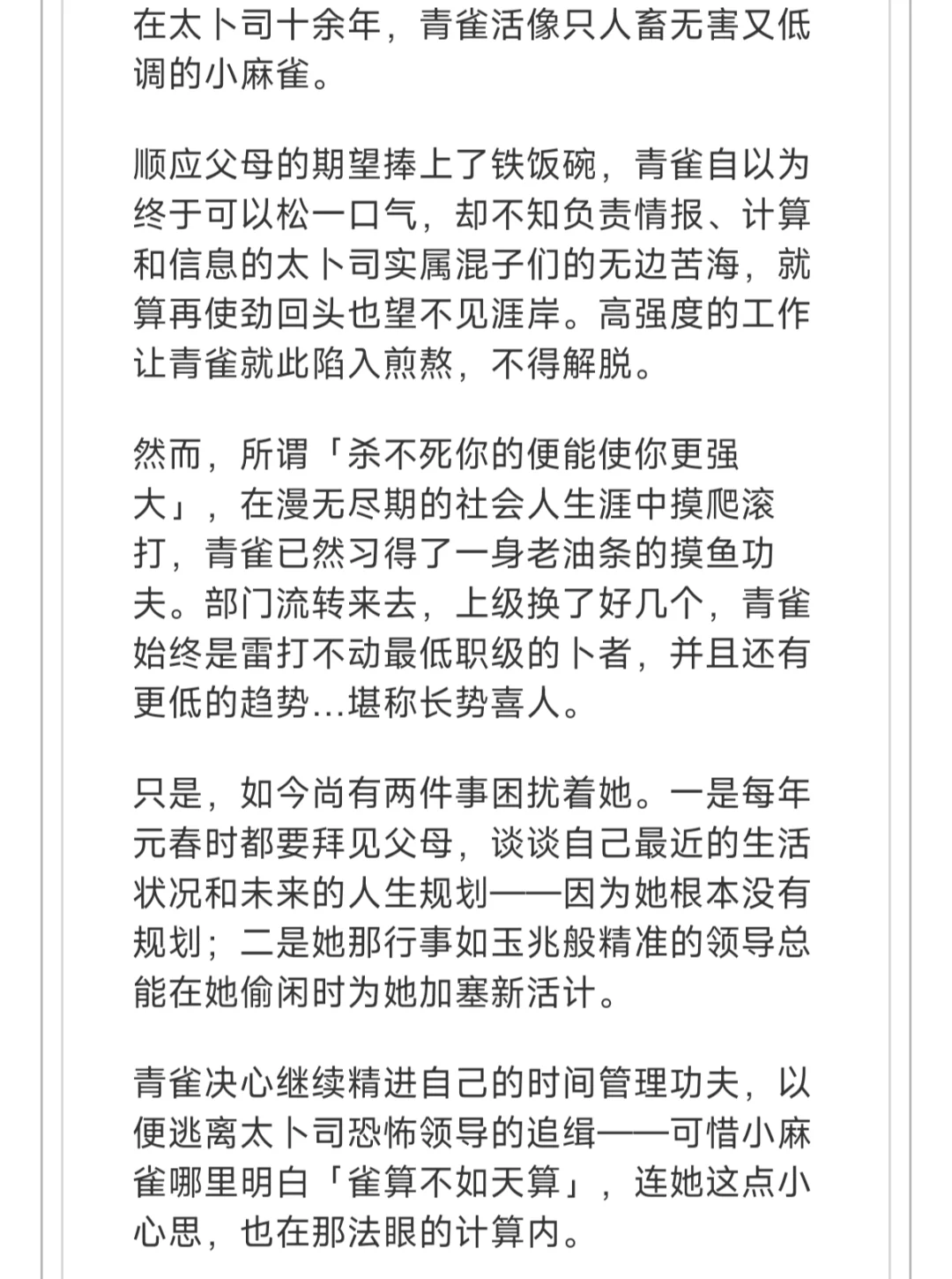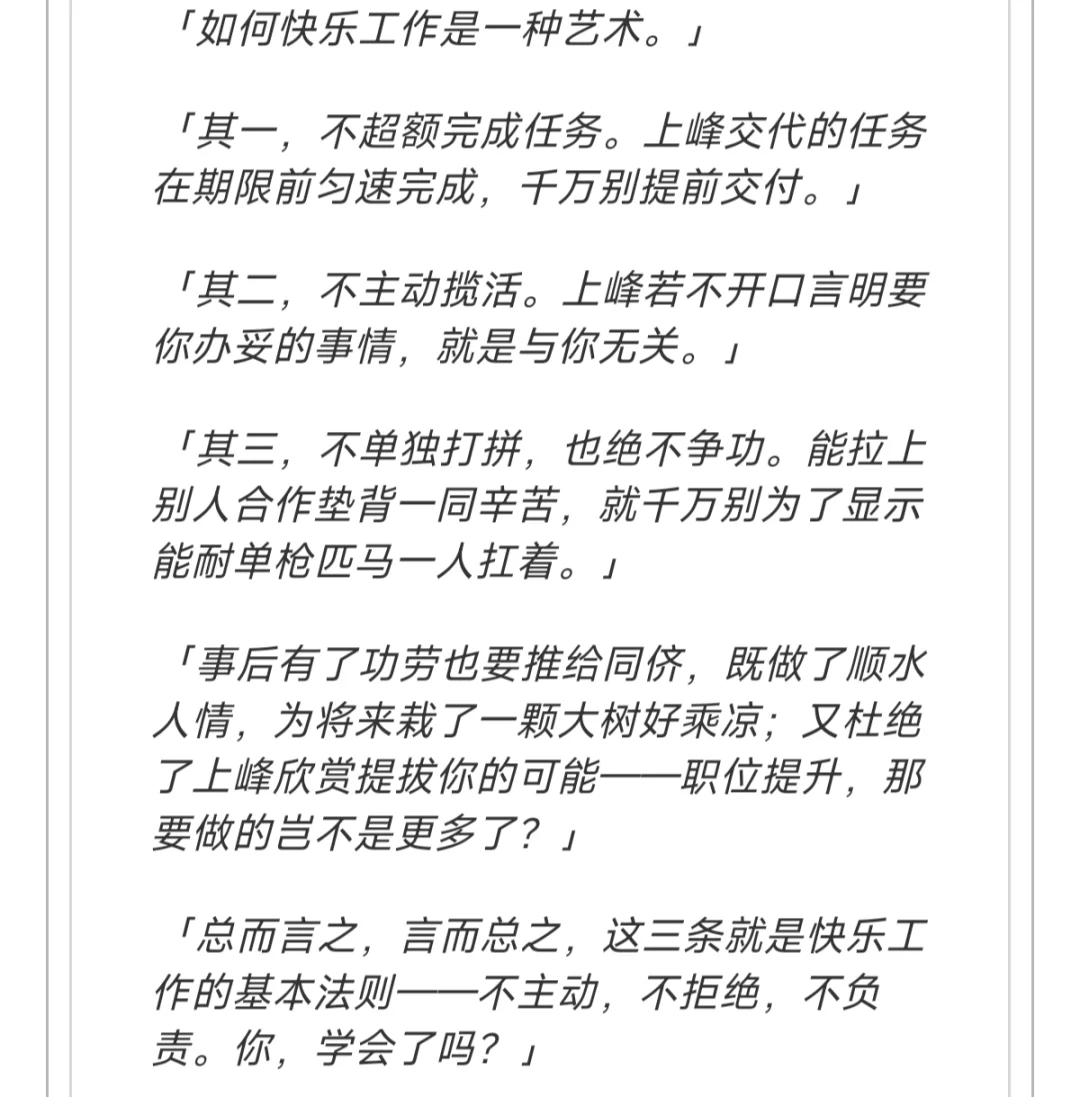 即使在混子们的无边苦海太卜司,她也能靠自己摸索出一套「摸鱼之道」,靠着不主动、不拒绝、不负责的态度,成功的让自己一直保持在最低职级——所谓是能力越小,责任越小,烦恼也越少。上班摸摸鱼,下班摸摸牌,这样的快乐小日子,真的让同为打工人的我羡慕哭了[哭惹R]