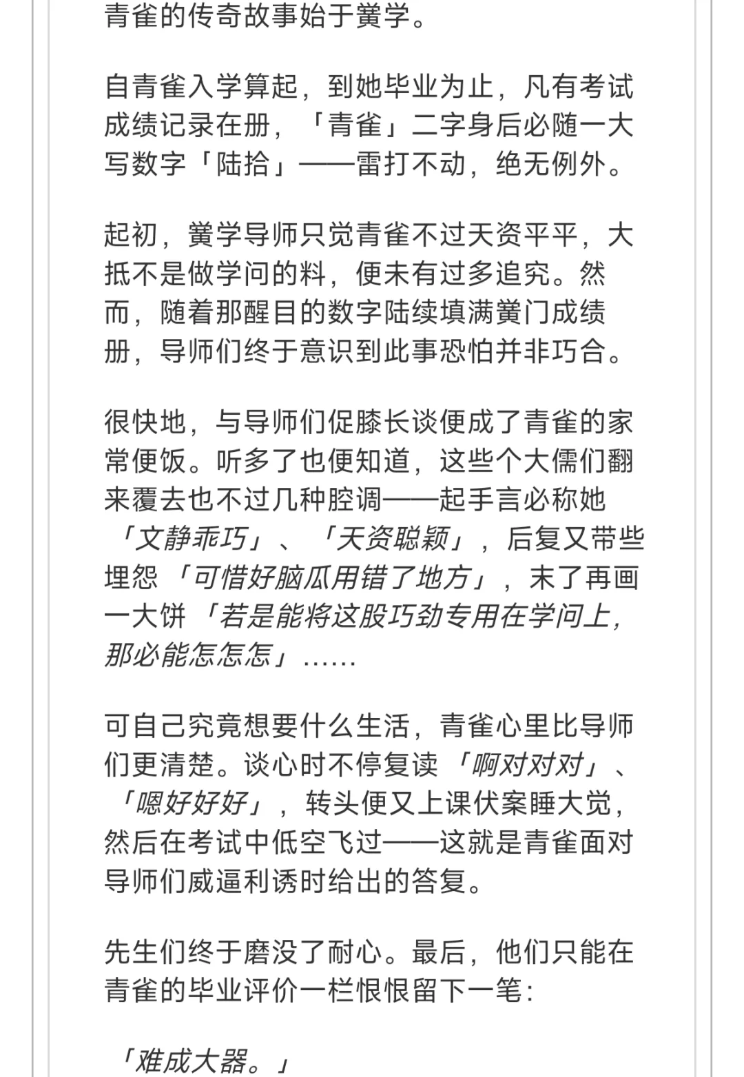 青雀其实非常的聪明,从她入学到毕业能够把分数控制在「陆拾」这个位置就可见一斑。但是她从小便知道自己要什么生活,不会被世俗的期望束缚自己,一切努力到刚刚好就好[暗中观察R]