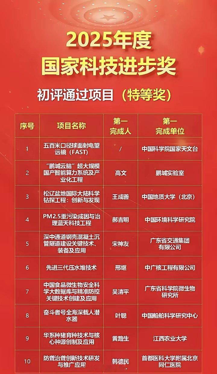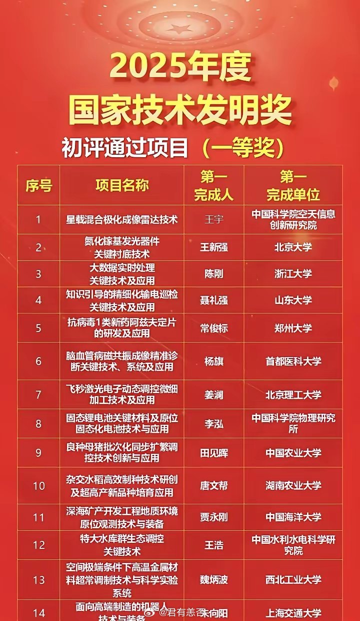2025年度诺贝尔科学奖已经都产生了,日本进账了2枚,让亚洲科研人员羡慕不已。专家说,2030年以后,我们的诺奖要开始井喷了,大不了再等5年。虽然没有诺奖,但我们有国家级的科学技术奖,初评已经公示了,虽不是最终获奖名单,但也是潜在获奖人值得高兴的事。如施一公团队就获得国家自然科学一等奖,如果最终获奖,大概离诺奖就不远了。国家自然科学奖、科技进步奖和技术发明奖竞争异常激烈,初评通过率约20%,含金量很高,代表了国内科学技术界最高荣誉,即使排名靠后的获奖人也是很厉害的