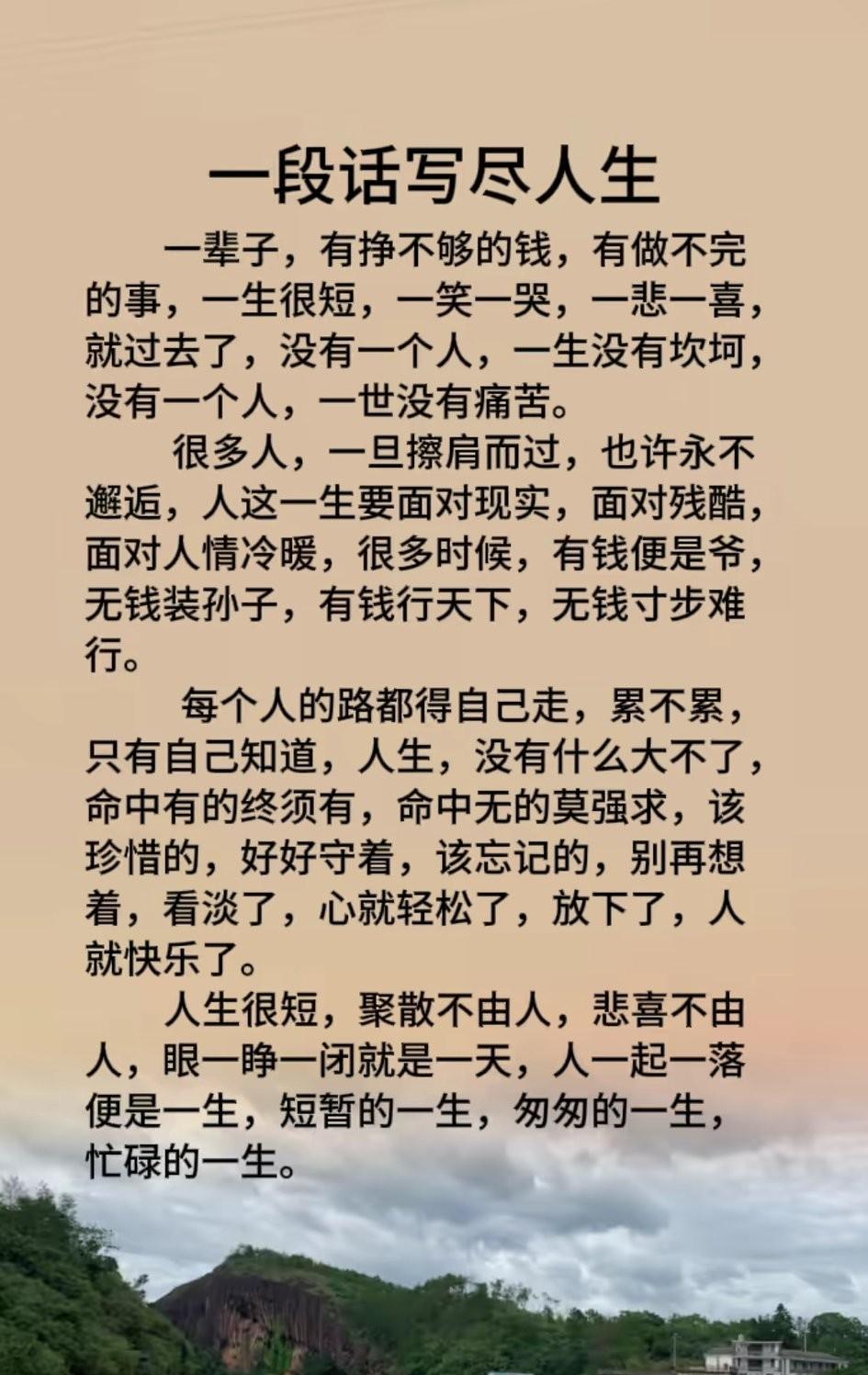 人生苦短,若白露未晞,应及时行乐,莫待空悲切。 人生苦短,别让琐事牵绊,勇往直前,追求梦想。 人生苦短,万事成蹉跎,活得潇洒,活得快乐,做自己喜欢的事,活出真实的自我。不图名,不图利,做事凭兴趣,做人凭良知。不求十全十美,但求无愧于心;不求人人满意,但求有人懂得;不求有功,但求无过。