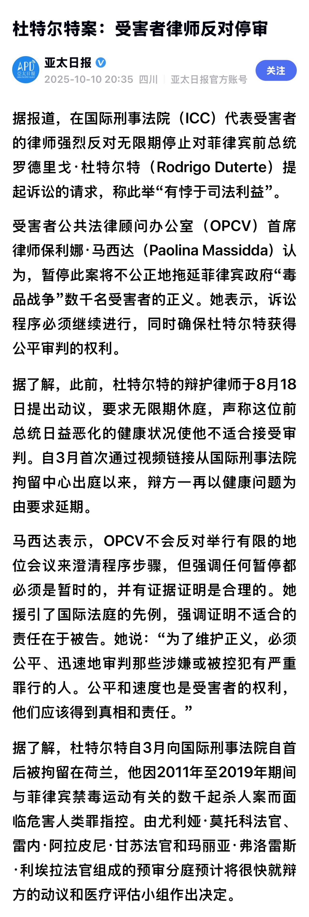 杜特尔特目前面临三种可能结局 1. 最坏情况:狱中病故 因年老且健康严重恶化,存在护理不及时在押病逝的风险。 2. 最佳方案:转移软禁 将其移至医疗更好的第三国软禁,以平衡健康危机与司法程序。 3. 长期方案:政治解决 若其女政治势力增强或与现政府达成交易,或能推动其获释,但难度很大。