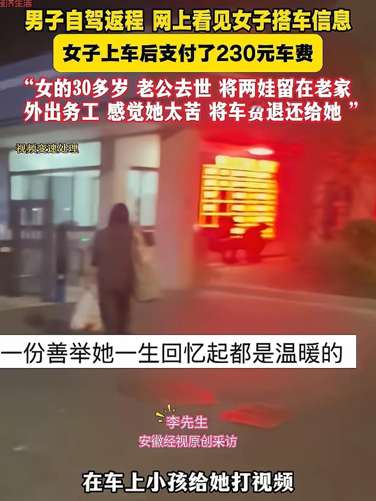 刷到河南这位大哥的事,心里一下就热乎了。 他和俩兄弟自驾从河南回宁波,想挣点油费就搭了个女乘客,说好230块车费。 路上聊起来才知道,女乘客三十多岁,老公去年没了,一个人带着13岁和5岁的俩孩子,常年在外打工挣钱。 正说着,孩子打视频来,哭着说想妈妈,她一下子忍不住,在车里哭得不行。 大哥看她这样,心里也不好受,当场就把230块车费退回去了,最后还绕路把人送到打工的工厂门口。 他说:“她一个女人家太不容易了,咱咋能要她钱?就当积德行善,盼她日子能好点。” 其实谁过日子都不容易,大哥本来也是想贴补油费,可看到别人难,还是忍不住伸了手。 这不是啥惊天动地的大事,可就是这份实在的善意,却最能戳中人。