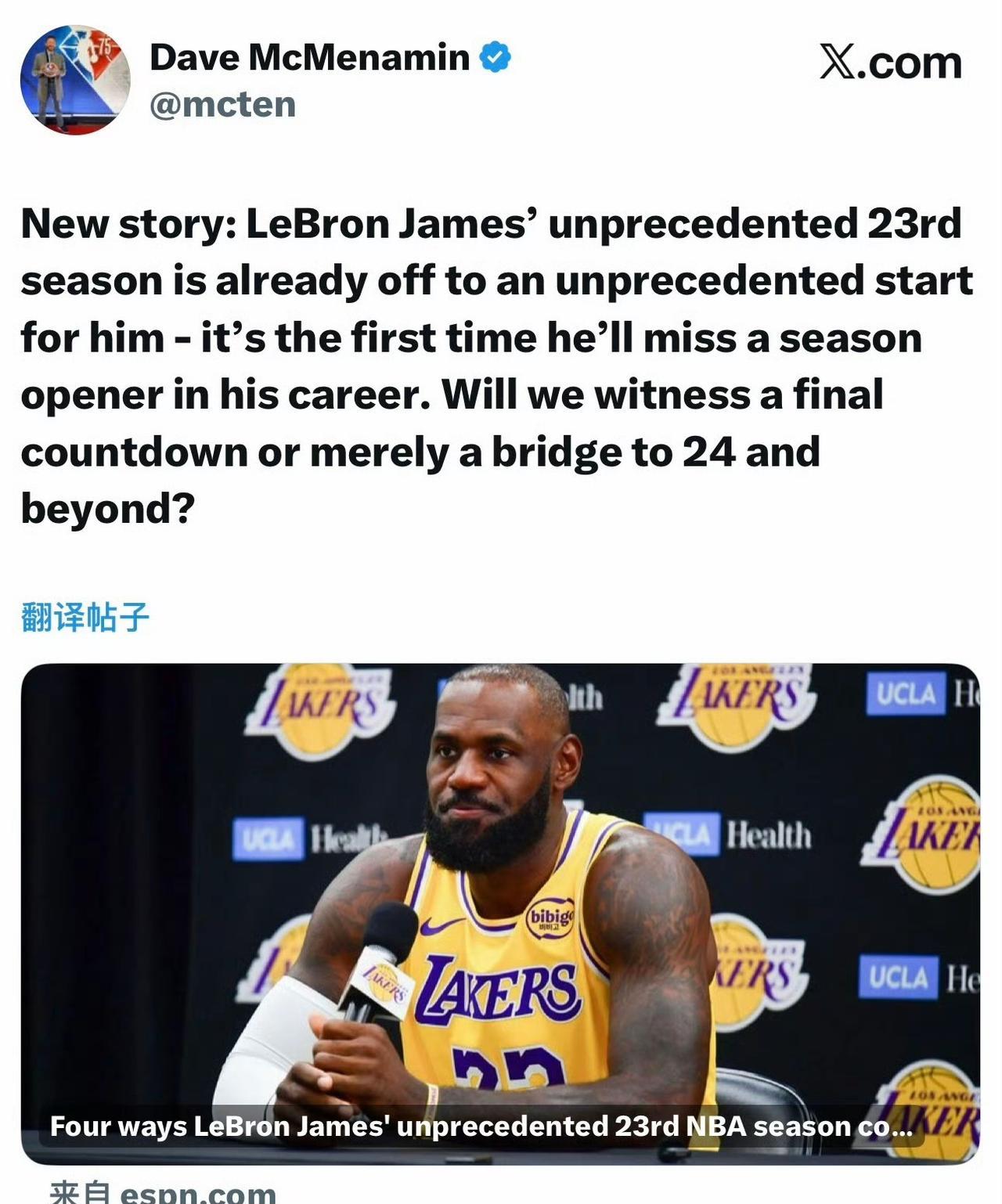 ESPN湖人记者DaveMcMenamin撰文: “詹姆斯史无前例的第23个赛