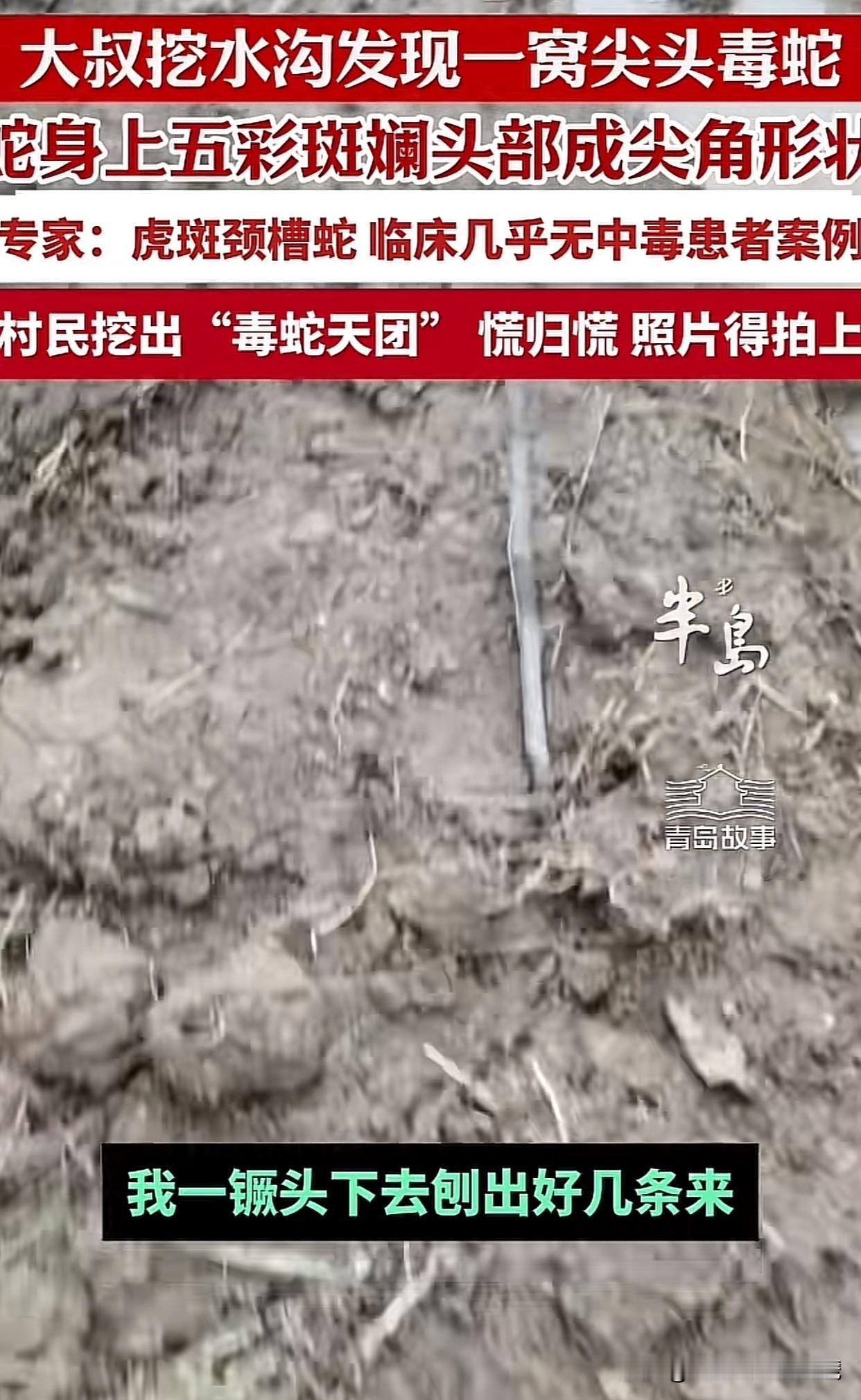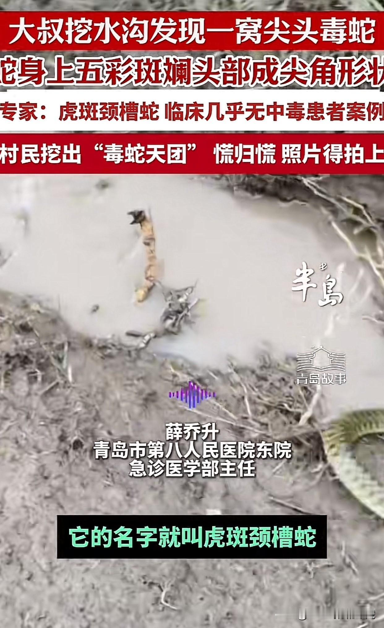 “头皮发麻!”青岛一位大叔挖水沟时,可真是吓了一大跳!一铲子下去,土里突然钻出一条脑袋尖尖的“大长虫”,后面还跟了一堆小蛇缠在一起,场面挺吓人。专家说这叫红脖颈槽蛇,毒牙藏在嘴巴靠里的位置,平时大家叫它“野鸡脖子”。 说实话,这蛇虽然有毒,但不算特别危险,咬人一般不会致命。不过更要注意的是,它可是国家保护动物,网友们戏称它是“牢底坐穿蛇”。万一不小心把它打死了,可能真要罚款甚至惹上麻烦。 我觉得这种蛇其实对咱们农田挺有用的,它们会吃老鼠,算是庄稼的“保安”。遇到这种情况该怎么做?我的看法是,别慌张,也别去招惹它,保持距离,然后打电话找林业部门或消防员来处理最稳妥。 咱们跟自然相处,互相尊重、保持距离才是最好的方式。既保护自己,也保护这些动物,这样生态才能平衡,对大家都好。