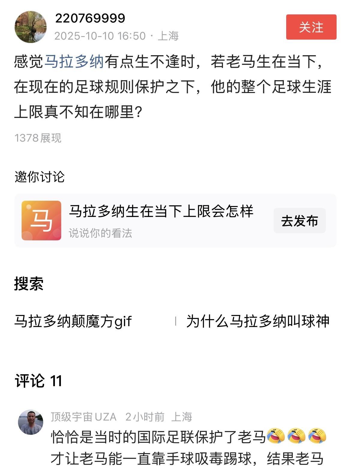 马拉多纳粉丝:在现在的足球规则保护之下,我马的足球生涯上限真不知在哪里。 有人怼他:恰恰是当时的国际足联保护了老马,才让老马一直靠手球吸毒踢球,结果老马也没能偷了几个冠军。 只说吸毒和禁药,就可以终身禁赛了;手球禁赛、打架禁赛,职业生涯支离破碎,有个屁上限。参赛时,现代足球的快节奏和强防守也不是肥马这样只能靠毒品和禁药支撑体能的人可以应对的。