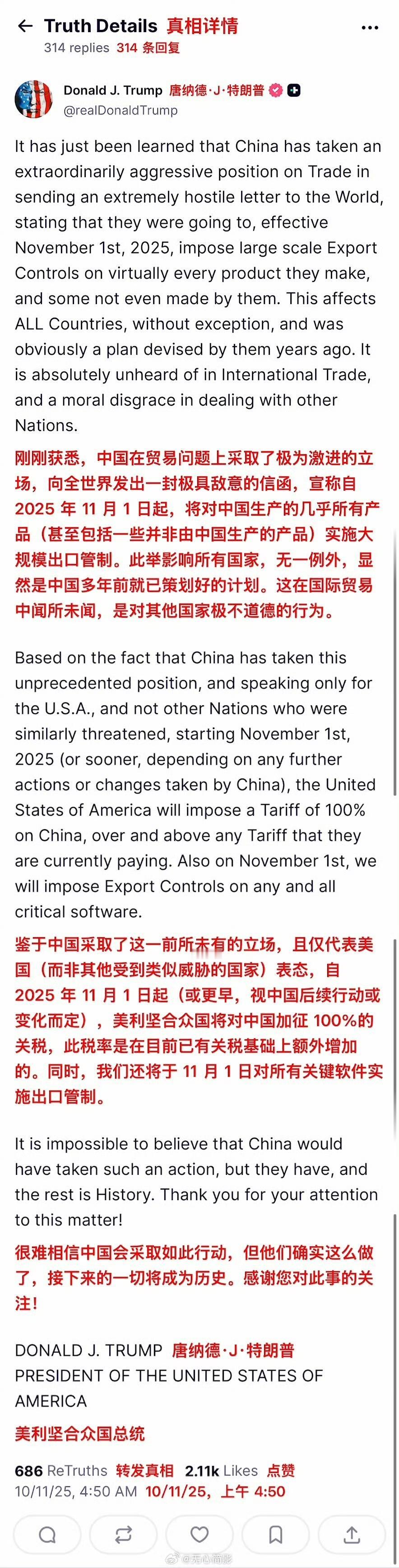 【琅河财经】全球股市暴跌,突发,特朗普宣布从 11 月 1 日起,对中国加征 100% 关税,此税率是在目前已有关税基础上额外增加的。同时,他们还将于 11 月 1 日对所有关键软件实施出口管制。 (果然又是关税[笑哭])