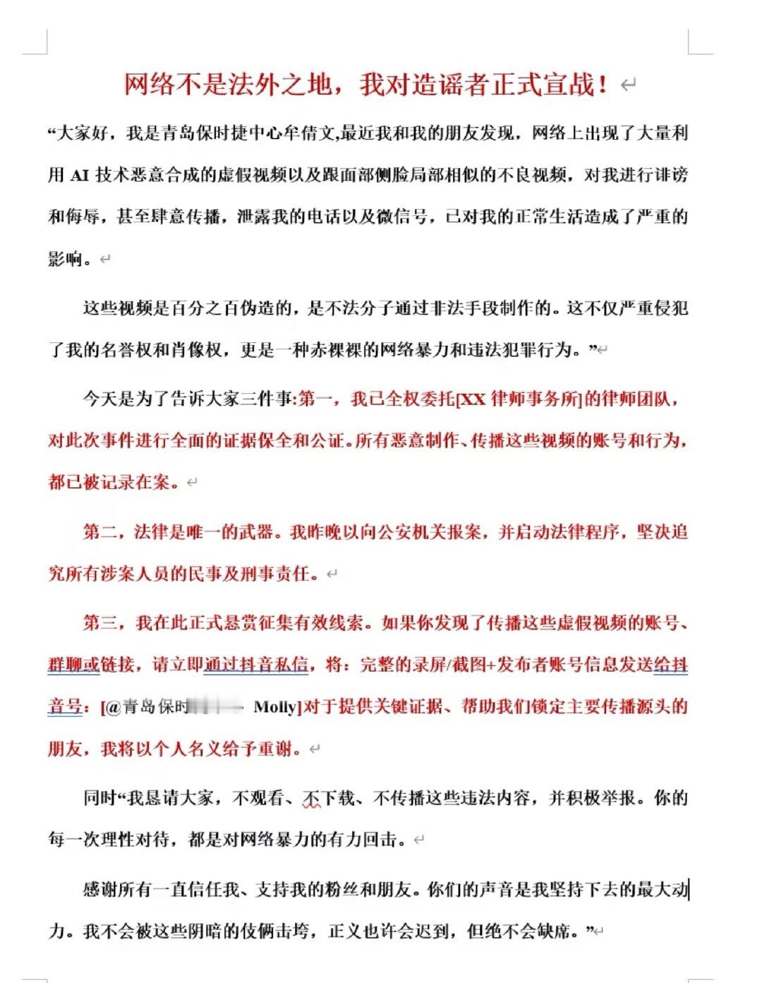 青岛保时捷女销售报案青岛保时捷女销售被造黄谣 10月10日,青岛保时捷女销售牟倩文发文:“近期,针对我的恶意AI合成视频已在网络传播,这些视频是百分之百伪造的,在此严正声明:所有相关内容均为伪造,我已委托律师完成证据固定,并启动法律程序追查到底。网络并非法外之地,造假者必将付出代价。感谢所有支持我的你们,我会用法律赢回尊严!”