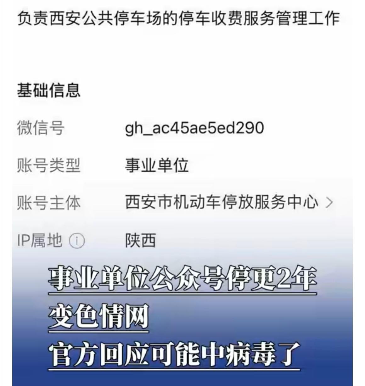 事业单位公众号停更两年,一点击竟跳转色情网站,“中病毒”的说法能信吗? 事业单位的公众号本应是服务大众的窗口,如今“西安停车服务号”却成了让人瞠目结舌的存在。从官方给出的“可能中病毒”的回应来看,有一定的可能性,但疑点也不少。 从技术层面讲,中病毒确实可能导致公众号出现链接跳转异常的情况。比如一些恶意病毒会入侵系统,篡改链接代码,从而使原本正常的页面跳转到非法的色情网站。 可仔细想想,这公众号停更2年,管理上必然存在疏忽。网络安全专家也指出,公众号跳转色情网站通常源于后台被恶意篡改、域名过期被恶意抢注或接口被植入非法代码。也许是长期缺乏维护,让不法分子有了可乘之机,导致后台被入侵,链接被篡改。这就像一扇长期未关的门,小偷自然容易进入屋内搞破坏。 之前也有类似案例,某单位的官方网站因长期无人维护,域名到期后被他人抢注,进而被用于传播非法信息。还有一些公众号因工作人员操作失误,误将恶意代码植入后台,导致出现异常跳转。 所以说,这起事件不能简单地归结为“中病毒”。要彻底查明真相,需要专业人员进行深入调查,检查服务器日志、代码等,才能确定到底是中病毒,还是存在其他更严重的管理漏洞或人为恶意操作。只有把问题查清楚,给公众一个交代,才能避免类似的闹剧再次上演,也才能让事业单位的网络服务平台真正发挥应有的作用,而不是成为让人诟病的“失控机器”。