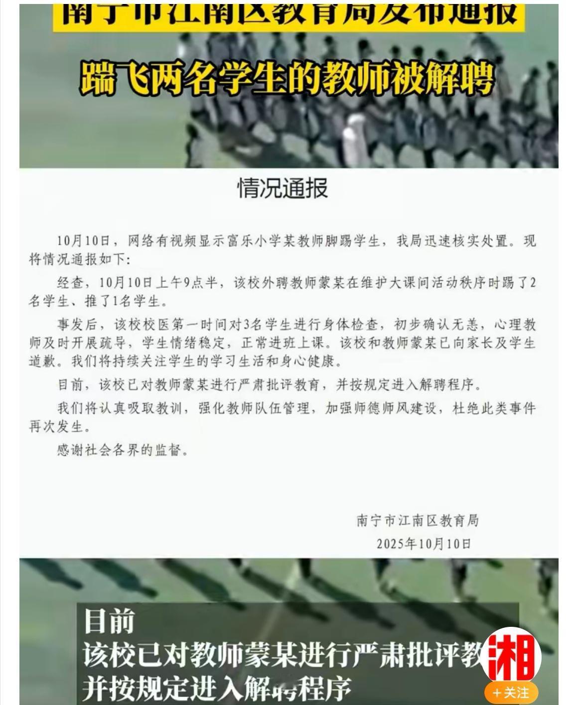 “老师踹飞学生”冲上热搜!外聘身份挡不住解聘,家长:早该如此! 老师踹飞学生的行为性质极其恶劣,不仅违背了教师职业道德的底线,更对学生的身体和心理造成了双重伤害,这样的老师必然应该被解聘,甚至需要承担更严肃的责任。 教育的本质是呵护与引导,教师手中的“权力”应当是耐心与智慧,而非暴力。学生即便有调皮之处,也该用沟通、教育的方式引导,动辄拳脚相向,本身就背离了教育者的基本素养。外聘身份不能成为减轻责任的借口,反而说明学校在教师聘用和管理上存在疏漏——连基本的师德把关都没做好,如何保障学生的安全? 教育局的通报和学校的道歉是必要的,但更重要的是让所有教育从业者警醒:讲台不是施展暴力的地方,学生的身心安全永远是底线。对于伤害学生的行为,零容忍才是对教育尊严的守护,也是对每个孩子的负责。这样的老师被解聘,是最基本的处理,只有划清红线,才能让校园真正成为安全的成长空间。