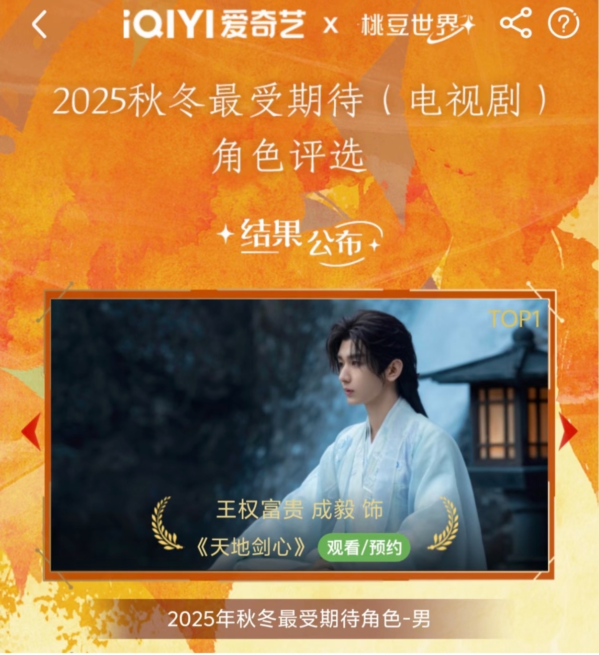 成毅《天地剑心》王权富贵获爱奇艺秋冬最受期待角色