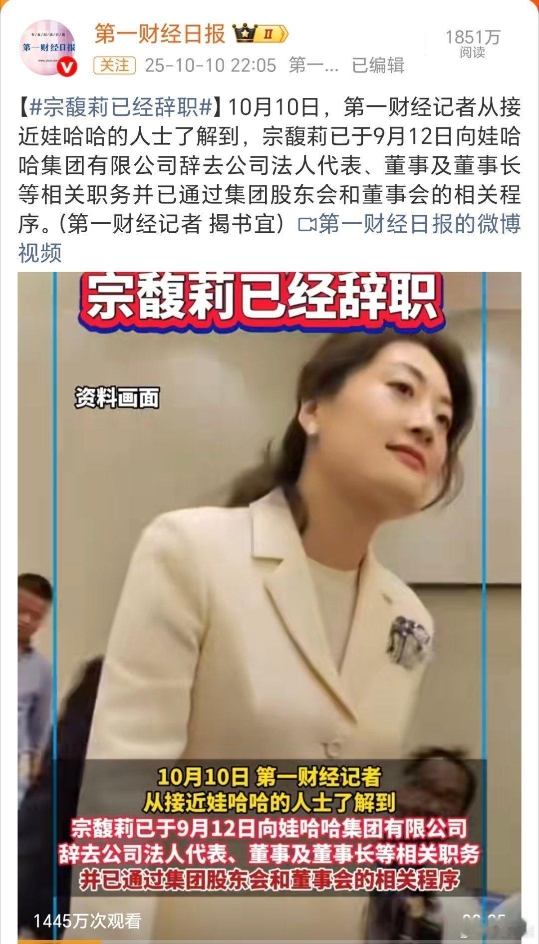 昨晚,第一财经报道了宗馥莉辞职的新闻,迅速引发了网络热议,微博、朋友圈、微信群等社交平台也都刷屏了,网友更是直呼“字少事大”。