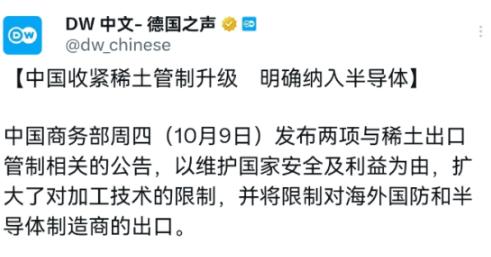 出手力度非常大!外媒意识到事态严重了!在我们宣告对稀土技术进行管制之后,德媒感到事态非常的严重!10月9日,德国之声刊文表示,中国这一次稀土技术管制力度非常的大。而这其中两个方面,将会给美国等国家构成非常大的麻烦。 10月9日,商务部一口气甩出第61号和第62号两份公告,直接把稀土管制的力度拉满,这波操作直接戳中了美国等国的两大死穴。 先说说第一个麻烦,这技术壁垒简直是焊死了的铁门,想绕都绕不开。稀土真正值钱的其实是背后的加工技术,中国早就把这条产业链玩得明明白白。全球稀土矿储量其实不少,美国地质调查局早年的数据显示全球有1.2亿吨,美国自己就有1300万吨,可储量再多也没用,就像守着金山却不会炼金。 中国光加工产能就占了全球 81%,更别说近十年的稀土专利数量早就超过其他国家的总和。这次管制直接把稀土开采、冶炼分离到磁材制造的全流程技术都圈进了管制清单,连生产线的调试维护技术都不让往外流,等于直接断了别人抄作业的可能。 更狠的是这次连边角料都算上了,公告里明确只要境外产品里中国稀土成分占比达到 0.1% 以上,出口就得拿中国的许可证。 别小看这 0.1%,稀土这东西本来就是“点石成金”的材料,导弹制导系统里的永磁材料差一点纯度都不行,性能能差出 100 多倍。以前他们还能买些粗加工产品自己再提纯,现在连带中国成分的半成品都受管制,等于被掐住了脖子。 更要命的是,新规连中国技术人员给境外提供帮助都禁止了,等于断了他们的技术外援,想建厂都没人会搭架子。 第二个麻烦更直接,直接戳中了美国等国的军事和高端制造命脉。稀土这东西早就是现代武器的“维生素”,之前美国国会有份报告算过账,造一架战斗机得用 920 磅稀土,一艘驱逐舰要 5200 磅,核潜艇更是要用到 9200 磅,小到导弹的方向舵驱动电机,大到航天器的磁轴承,没稀土根本玩不转。 现在新规明确说了,给军事用途的出口申请原则上就不批,这等于直接断了美军的补给线。以前他们还能通过第三国转一手蒙混过关,现在只要用了中国的稀土或者中国的技术,不管转几手都得要许可,想造假都难,国家安全部之前就警告过,有境外承包商靠伪造标签偷运,现在这招彻底失灵了。 高端制造领域同样遭重,新规里特别提了,用于14纳米以下逻辑芯片、256层以上存储芯片的稀土物项要逐案审批。现在全球顶尖芯片制造哪离得开稀土靶材?美国本来想在半导体领域卡别人脖子,结果反过来被稀土绊了一跤。连美国自己的磁铁公司老板都急了,说以后可能连设备都拿不到,就算拿到设备,调试维护的技术支持也没了,这生产线等于成了摆设。 德国媒体之所以慌得不行,因为德国汽车业早就押宝新能源,而电动车的驱动电机全靠稀土永磁材料,宝马、奔驰的电动车型要是没了稳定的稀土供应,转型计划就得打水漂。韩国工业部门已经急着评估影响了,德国这些汽车巨头自然更坐不住,毕竟他们的新能源转型可等不起产业链重建的时间。 从2006年开始中国就逐步收紧稀土管控,现在算是把技术这张王牌亮了出来。美国等国以前仗着能买到便宜的加工品,自己干脆不搞研发生产,把生态成本都丢给别人,现在想回头重建产业链,才发现根本不是花钱就能解决的事。 德媒看明白的其实不只是管制力度大,而是这招直接点中了全球产业链的死穴,核心技术和完整产业链都攥在中国手里,想摆脱依赖?没个十年八年根本没戏,这才是最让他们坐立难安的地方。