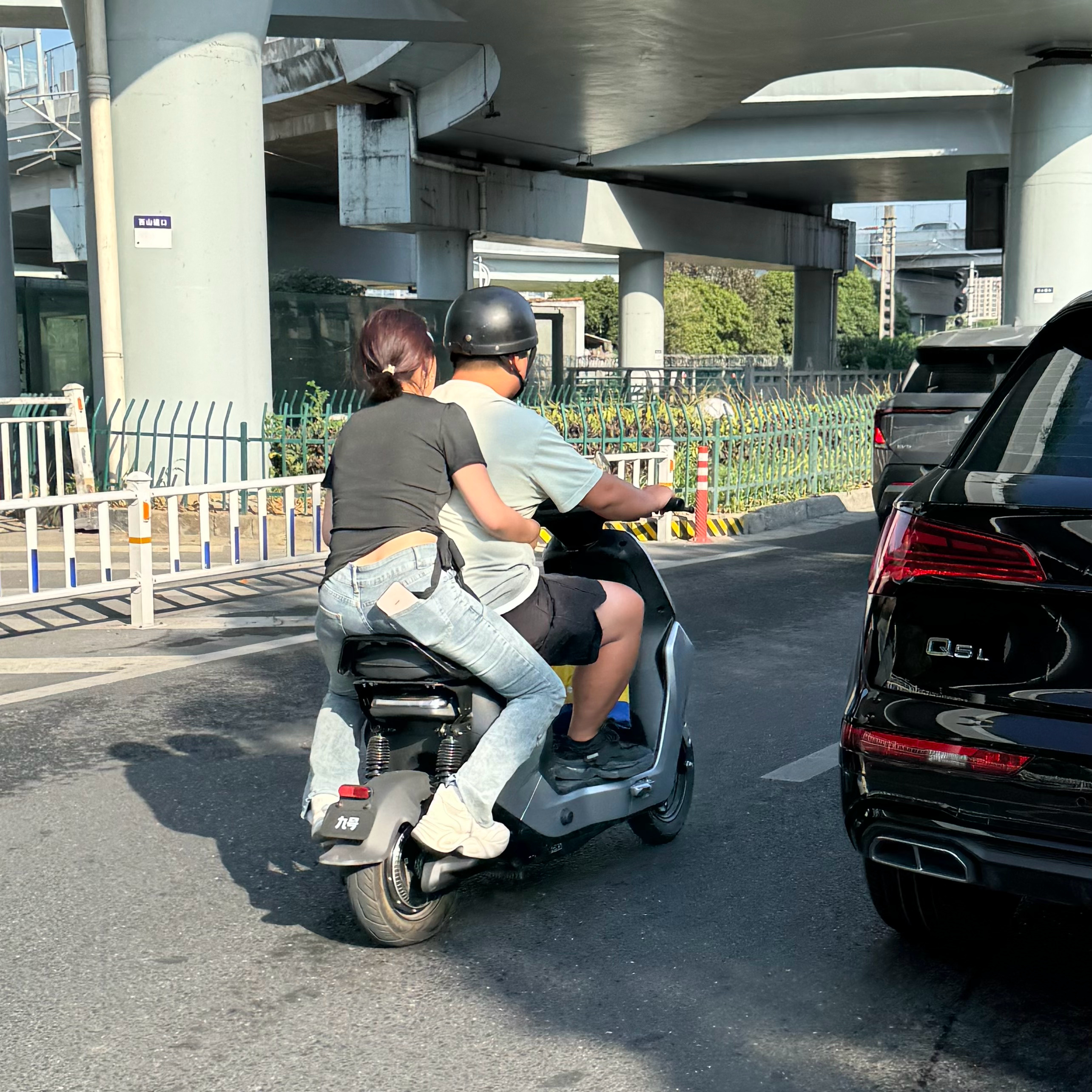 本来单座的新国标电动自行车带两个人就非常不安全,后边的人很容易掉下去,结果还在机动车道上骑。很多交通参与者这安全意识还得提升啊[裂开]