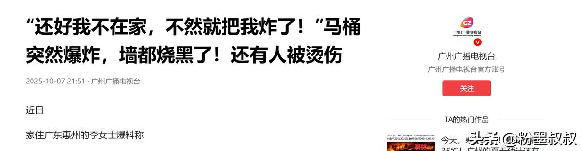 万万没想到!广东一女子在外旅游时,突然接到物业电话,被告知家里严重漏水,导致楼下邻居投诉,女子急忙委托朋友去家里看一下,可当听到朋友汇报的情况后,女子却傻了眼! 国庆假期嘛,广东惠州的李女士早就计划好了,带着家人去外地旅游,一路上逛景点、吃小吃,玩得别提多开心了。可谁能想到,一场让她措手不及的麻烦,正悄无声息地等着她,10 月中旬的一天,她正拿着刚买的文创纪念品跟孩子说笑,手机突然响了来电显示是小区物业,她随手接起,可电话里物业的话让她瞬间没了兴致。 物业说:“李女士,您家好像漏水了,漏得还挺严重,楼下邻居家的天花板都在滴水,人家已经来投诉好几次了,您看能不能赶紧处理下?” 李女士当时手里还拿着刚买的奶茶,一听这话瞬间就没心思喝了,整个人都懵了,出门前她特意把家里的水电都检查了一遍,总阀也确认关好了,怎么会漏水? 还漏到楼下邻居家了?她赶紧跟物业道歉,说自己现在在外省,没法马上回去,能不能先帮忙多留意下,她这就找朋友上门看看情况。 挂了电话,李女士急得不行,赶紧给住在同一个小区的朋友打了电话,把情况一说朋友也挺仗义,立马答应 “我现在就过去,你别着急”,等待的那十几分钟,李女士坐立难安,一会儿担心水漏得太厉害,把家里的地板泡坏,一会儿又怕楼下邻居那边损失太大,心里乱糟糟的。 直到朋友发来视频通话,她赶紧接起,可点开视频的那一刻,李女士感觉脑子都空了,哪里是简单的漏水啊,家里简直成了 “灾难现场”! 朋友拿着手机在主卧卫生间拍,李女士一眼就看到,卫生间里哪还有平时干净的样子?地上全是积水,混着灰尘和碎渣,踩一脚都能溅起泥点,墙上被熏得黑乎乎的,像被烟熏过一样,连瓷砖缝里都渗着黑渍,窗户玻璃裂了好几道缝,风一吹还晃悠悠的,好像随时会碎,最吓人的是那台智能马桶,彻底炸得不成样了,陶瓷碎片散得到处都是,有的还嵌进了地板缝里,马桶原本的位置只剩下一堆残骸,空气里飘着一股呛人的焦糊味,朋友说着话都忍不住咳嗽了两声。 李女士看着视频,手都有点抖朋友赶紧说 “我已经把你家总水阀关了水不漏了,你别太着急”。,她这才稍微缓了缓,唯一庆幸的是,当时家里没人要是有人在卫生间附近,被碎片崩到或者被水浇到,那后果可就严重了,现在想想都后背发凉。 后来李女士才慢慢回忆起来,这台智能马桶是她前阵子在网上买的,当时看它长得跟某知名品牌差不多,价格却便宜不少,折后才 1090 块,她还以为捡了个大漏,没多想就下单了。 现在才知道这哪是捡漏啊,根本就是个 “定时炸弹”,智能马桶里面的结构本来就复杂,又有电路又有加热装置,还得走水路,对安全标准要求特别高,那些山寨货为了压成本,肯定偷工减料,短路、过热都是常事,这次直接炸了也算是早晚会发生的事。 等李女士想找卖家讨个说法的时候,才发现更闹心的,她点开购物链接,卖家店铺都快成 “僵尸店” 了,发消息半天没人回,打电话也提示 “已关机”;她找电商平台客服,客服倒是说会介入处理,可问什么时候能有结果,对方只说 “会尽快”,具体多久也没个准信,李女士心里也没底,知道这维权估计难了。 现在李女士也没心思旅游了,赶紧订了返程的车票,满脑子都是家里的烂摊子和楼下邻居的赔偿问题。她这事儿后来被报道出来,好多人都跟她有一样的感慨,真是万万没想到啊!本来想买个智能马桶提升生活质量,结果反倒惹了这么大的麻烦,还差点出了安全事故。 (信息来源:广州广播电视台——“还好我不在家,不然就把我炸了!”马桶突然爆炸,墙都烧黑了!还有人被烫伤)