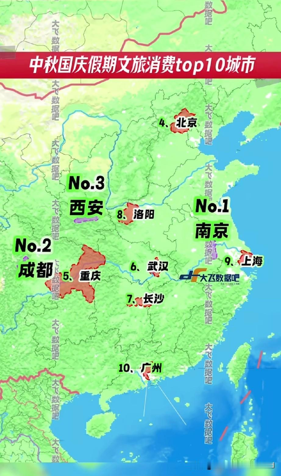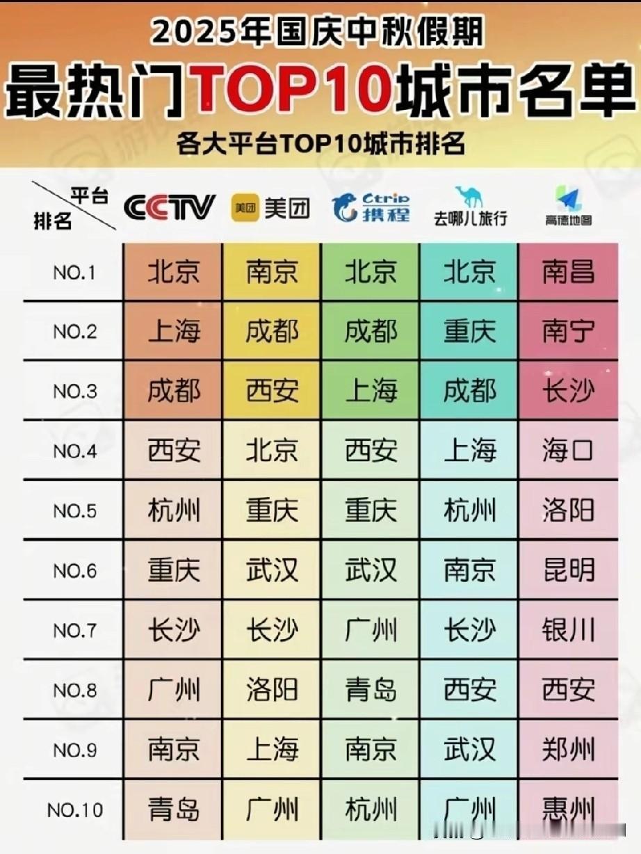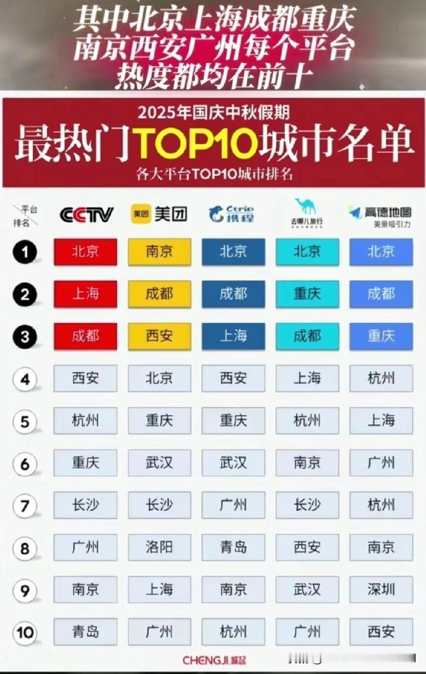 2025年国庆中秋旅游前十出炉。 北上广,成渝镐,宁。 出现在各大平台前十。 旅