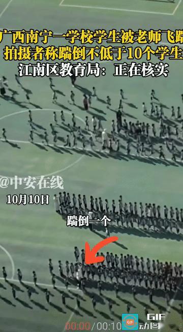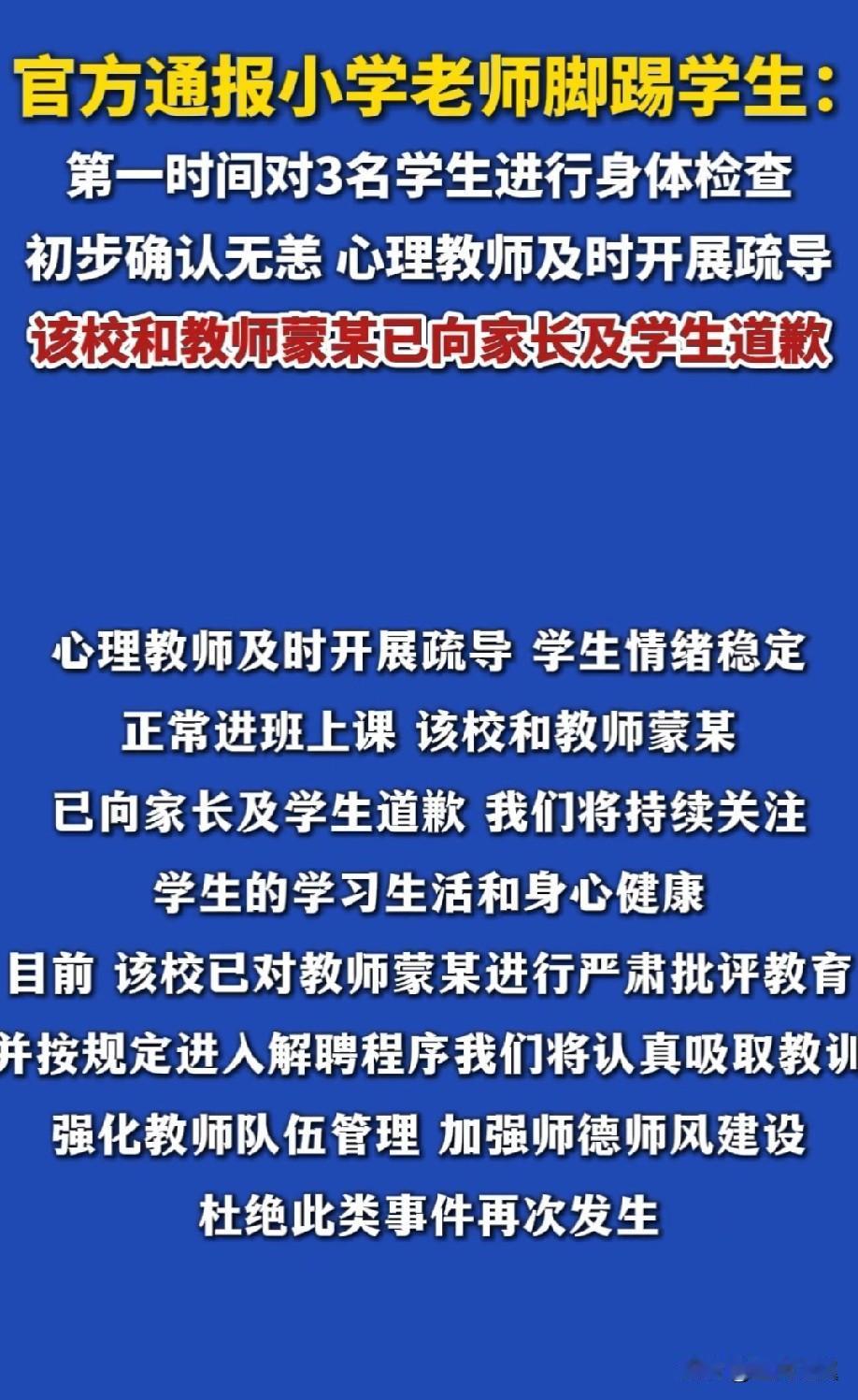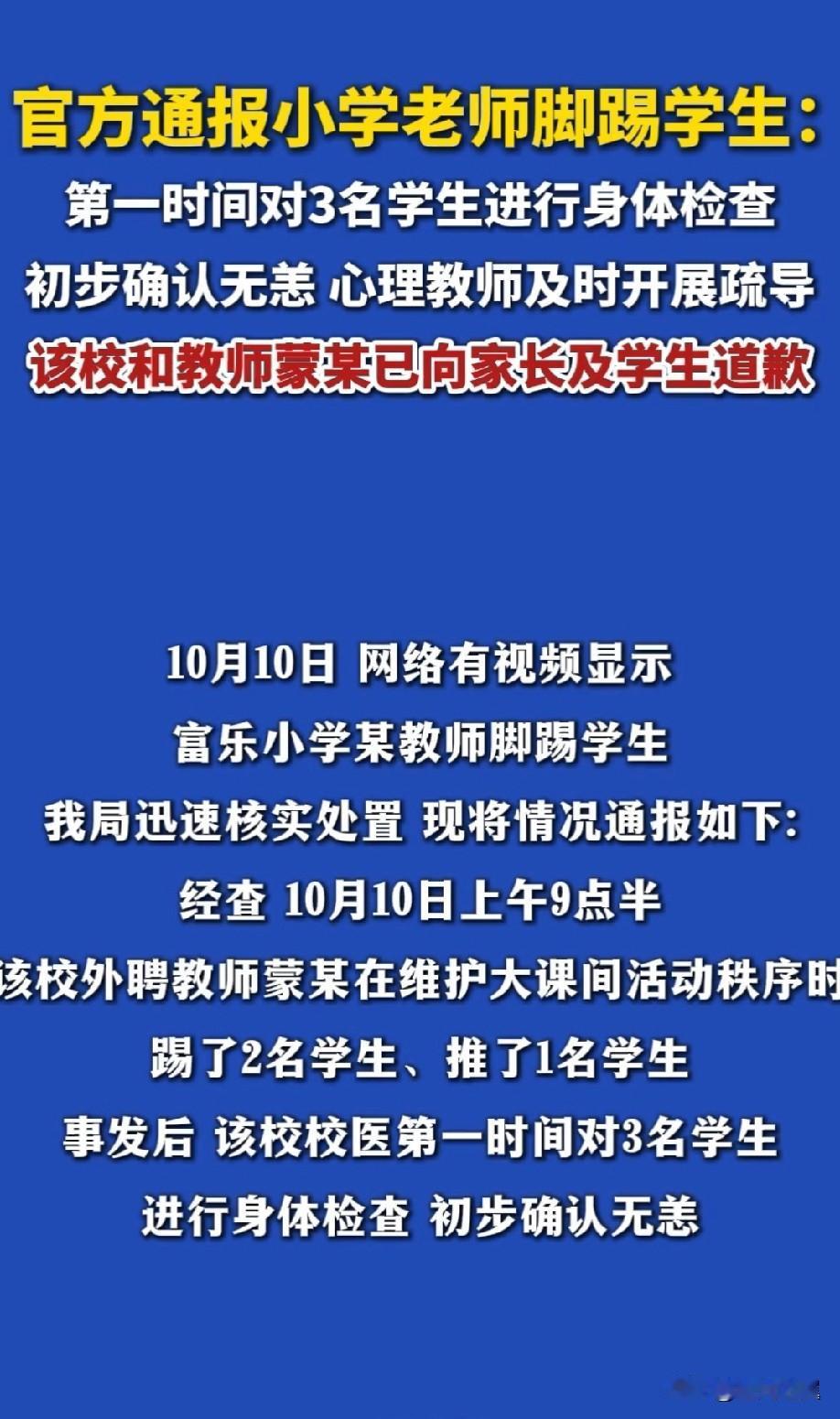 “枉为人师!”广西南宁,有网友发视频称一学校操场上,有一名老师不知什么原因,竟用脚接连踢踹学生! 来源:【中安在线】 从网传视频可以看出,此时学生们都来到了操场上,应该是到了课间操的时间了,有一部分学生都已经排队站好了! 然而,就在这时,一名身穿白色上衣的老师从学生旁边走过时,不知为何,竟直接用脚将一学生踹倒在地,紧接着又踹倒了第二名学生,而这两名学生被踹倒后,也不敢多言,便自己从地上起来重新站回了自己得位置! 而那名老师好像并不觉得自己做错了什么,头也不回得继续向前走去,又在第三名学生面前站立,对着那名学生指指点点,说教了一番! 该视频迅速在网络上发酵,引发公众广泛关注和批评! 面对舆论关切,南宁市江南区教育局迅速行动,调查过后于事发当晚就发布了情况通报。 通报明确指出,经查,富乐小学外聘教师蒙某在维护大课间活动秩序时踢了2名学生、推了1名学生。 江南区教育局确认,该校和教师蒙某已向家长及学生道歉。 事件发生后,该学校校医第一时间对3名学生进行了身体检查,初步确认学生身体无恙! 学校心理教师也及时介入,对学生开展了心理疏导! 据官方通报,目前学生情绪稳定,已正常进班上课! 南宁市江南区教育局在通报中表示,富乐小学已对教师蒙某进行严肃批评教育,并按规定进入解聘程序。 通报特别强调,蒙某是学校的外聘教师。 江南区教育局表示,将认真吸取教训,强化教师队伍管理,加强师德师风建设,杜绝此类事件再次发生! 此次事件虽然因处理迅速而告一段落,但操场上那道飞起的脚影,却在我们心中划下了一道深深的伤痕! 江南区教育局承诺将“加强师德师风建设”,这不仅是制度上的完善,更是对每一位教育工作者心灵的叩问! 教师手中的戒尺早已落下,但量度的不是学生的对错,而是自己的师德!