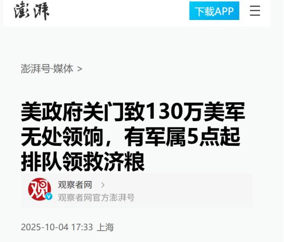 白宫新闻发言秘书莱维特传出来一极度令人振奋的个好消息!她说由于美国政府停摆,导致130万美军现在工资发不出来。 白宫新闻发言秘书莱维特最近可是抛出个“极度令人振奋”的消息——因为美国政府停摆,130万美军眼下连工资都领不到了。这话听着像玩笑,却是实打实的现状,据央视网10月8日的报道,莱维特在发布会上都亲口承认了这事儿,而众议院议长约翰逊7日更是直接放话,要是10月13号前还解不了僵局,15号起军饷就得正式停发。 说穿了,这又是美国两党把老百姓的饭碗当掐架筹码的老戏码,只不过这次拿的是国防预算和百万军人性命当赌注。共和党那边咬死了2025财年的国防拨款法案里必须加钱修边境墙,还得把民主党力推的新能源项目预算一刀砍下去。 民主党更不让步,非要往法案里塞给北约东翼国家的军事援助款,少一分都不行。两边就这么针尖对麦芒,谁也不肯退半步,仿佛忘了法案背后连着两百多万人的生计。 僵持到现在,参议院7天里投了5次票,两党各自提的法案全被对方否决,压根没个能落地的方案。众议院更干脆,直接摆烂宣布休会到14号再谈,把200多万联邦雇员就这么晾在了一边——要知道这些人里,75万直接被停职回家,剩下的像军队、空中交通管制员、联邦消防员这些“必要岗位”,被逼着继续上班,工资却一分钱没有。 有联邦雇员在社交平台吐槽:“总统和议员的工资一分不少,我们却要饿着肚子干活,这叫什么道理?”就拿美军来说,130万人里有驻守海外的,有在本土待命的,不少人上有老下有小,房贷车贷等着还,突然断了收入来源,日子直接没法过。 德州一位陆军中士的妻子接受采访时说:“原本计划月底给孩子交学费,现在只能先去刷信用卡,真不知道停摆要拖到什么时候,利息都快付不起了。” 更糟的是,白宫预算办公室一份备忘录里还藏着更狠的话,特朗普政府居然警告说,这些停发的工资可能根本不会补发,特朗普自己也含糊其辞,说“补不补要看是谁”,这哪是把军人当保卫国家的英雄,分明是当成了博弈的炮灰。 不光是军人,联邦雇员的日子同样难熬。美国交通部说,联邦航空局4.4万名员工里,1.1万人被迫停薪休假,剩下的1.3万名空管人员得无薪上班,不少人每周要干6天,累得扛不住,最近请病假的人越来越多,有些地区空管人数只剩停摆前的一半,航班延误成了家常便饭。 10月7号那天,纽约肯尼迪机场就有20多个航班晚点超过两小时,旅客骂声一片,旅游业分析师都在担心,再拖下去怕是要影响11月的感恩节出行高峰。 其他部门的惨状也没好到哪去。证券交易委员会90%以上的员工被迫休假,只剩393人处理紧急执法,市场监督几乎成了摆设;卫生与公众服务部3.2万名员工停工,公共卫生信息发布、医学研究全断了档,连新药审批都得往后拖。 就连劳工统计局都没法按时公布就业数据,整个国家的公共服务几乎陷入半瘫痪状态。白宫7号也承认,要是停摆继续,联邦雇员的退休手续办理、医疗保险开放季都会受影响,可这些问题在两党眼里,好像还不如自家的政治诉求重要。 更让人寒心的是,白宫早就放出了裁员的风。莱维特10月1号就在记者会上说“裁员迫在眉睫”,还把锅甩给民主党,说特朗普已经让预算办公室和各部门商量砍开支的地方。 副总统万斯也跟着警告,停摆再拖几天,裁员就可能成真。要知道以前政府停摆,大多是让员工无薪休假,后续总会补发工资,这次却直接要裁员,明摆着是拿联邦雇员的工作当施压对方的工具,民主党领袖舒默都忍不住指责共和党是在“恐吓员工”。 最讽刺的是,这场闹剧里,真正受伤的都是普通人。那些在边境巡逻的警员,冒着危险执勤却拿不到工资;那些在实验室里搞科研的人员,项目中断可能影响整年的进度;那些守在导弹基地的士兵,肩负着国家安全却要担心家人的生计。 而华盛顿的政客们还在电视上互相指责,共和党骂民主党“不顾边境安全”,民主党批共和党“漠视盟友需求”,没人提一句那些被逼到绝境的联邦雇员。 现在众议院休到14号,留给他们的时间没几天了,可看这架势,要是两边还不肯松口,别说军饷,恐怕更多人的工作和生活都要被拖进泥潭里。 有经济分析师算了笔账,政府每停摆一天,美国经济就要损失好几亿美元,更别说那些看不见的影响——比如公众对政府的信任度暴跌,士兵士气受挫。只是不知道那些在国会山吵架的政客们,夜里会不会想起那些无薪上班的空管员,想起那些等着工资交房租的士兵家属,想起他们竞选时说过的“为人民服务”。 信息来源:澎湃新闻美政府关门致130万美军无处领饷,有军属5点起排队领救济粮2025-10-04