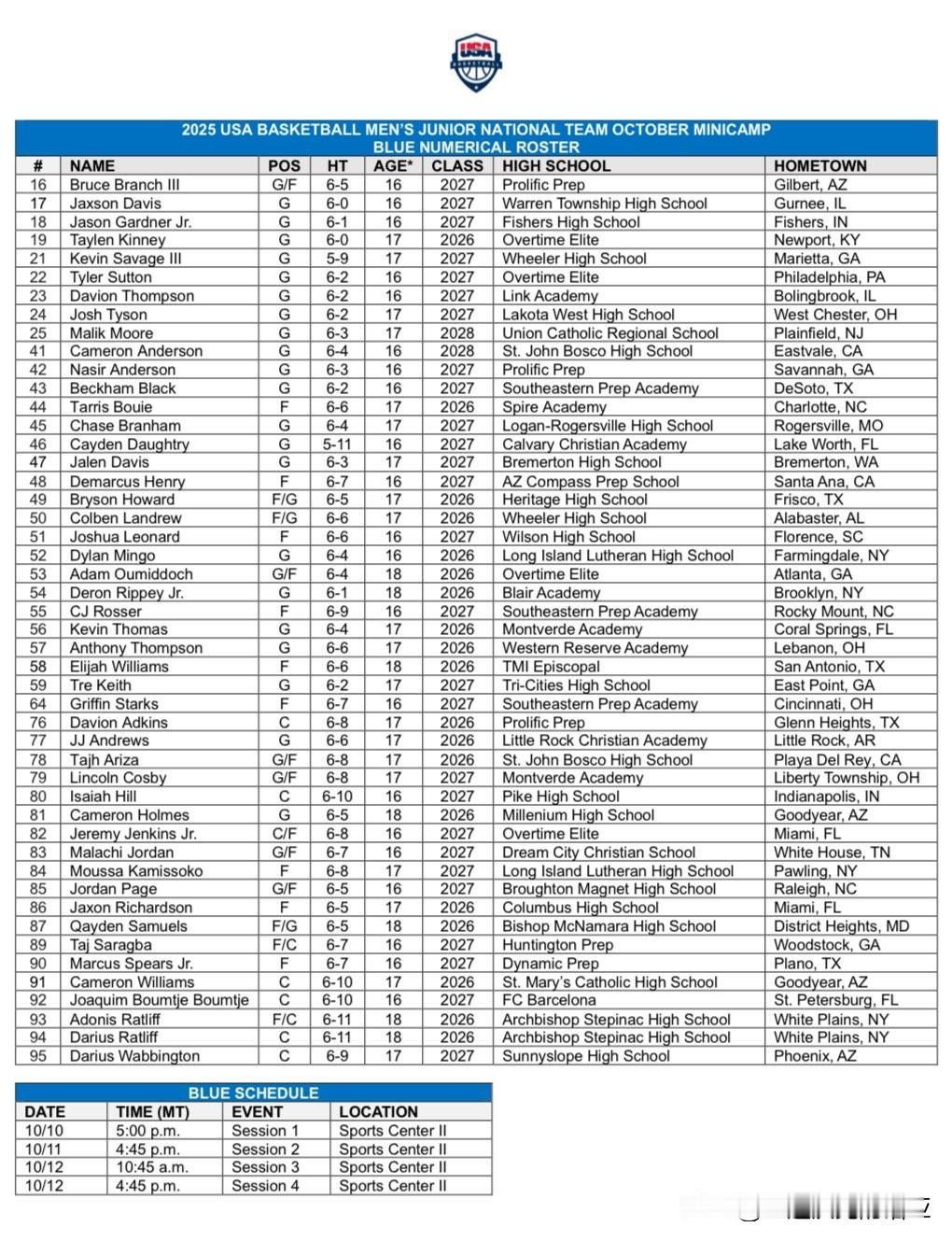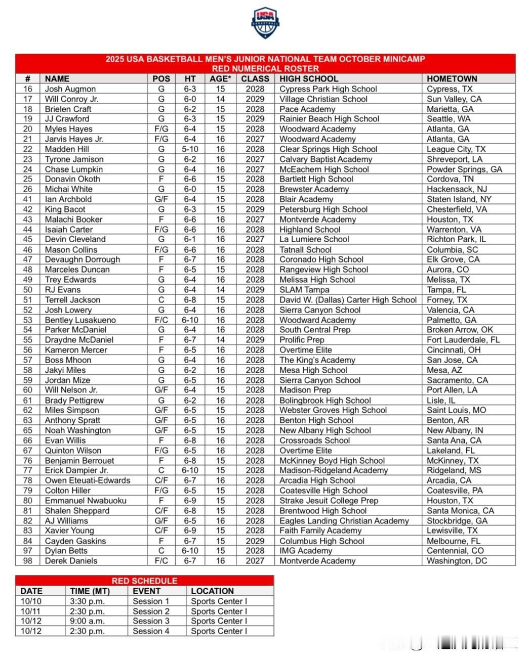 全美94位最优秀的14-18岁青少年齐聚在科罗拉多斯普林斯参加美国男篮十月迷你训练营,2029届招生 高一新生包括King Bacot,Will Conroy Jr,JJ Crawford,RJ Evans,Cayden Gaskins与Draydne McDaniel。