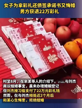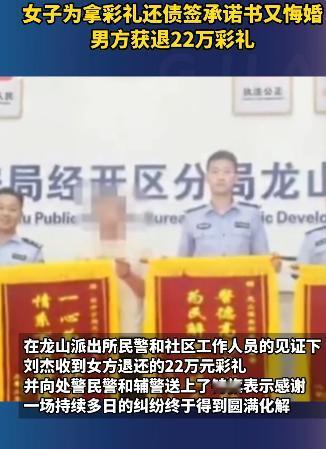 安徽芜湖,女子家中负债累累,为解燃眉之急,她在同学的诱导下,和一男子签订结婚承诺书,一次性拿到了22万的彩礼。相处两个月后,女子觉得这不是她想要的爱情,于是提出悔婚。男子没有强求,同意退婚但要女子退还22万彩礼,不料却遭到女子拒绝。女子:彩礼用来给老家还债了,只有13万爱要不要。男子报警后,民警的处理让人竖起了大拇指。 说起彩礼,在很多地方的传统里,本是男女双方定下婚约时,男方给女方的一份诚意,是对未来小家庭的祝福。 可最近在安徽芜湖,一场因彩礼引发的纠纷,却让不少人唏嘘。 事情要从今年7月说起。22岁的云南姑娘和某,那段时间正为家里的债务愁得睡不着觉,电话里父母唉声叹气的声音,让她心里像压了块石头。 就在这时,同学余某找到了她,说有个“快速凑钱”的办法。 芜湖有个叫刘杰的男的,想找个对象结婚,愿意出高额彩礼,你要是愿意去芜湖结婚,钱的事不就解决了? 和某一开始还有些犹豫,可一想到家里的债,还是动了心。 在余某的撮合下,她和刘杰见了面。 刘杰是芜湖本地的普通上班族,为人老实,想着尽快成家,见和某点头同意,便按当地习俗提了彩礼的事。 双方谈妥后,和某还签了一份“结婚承诺书”,白纸黑字写着“收到22万彩礼后,愿意与刘杰登记结婚”。 刘杰对这门婚事挺上心,特意去银行取了22万现金,用红色的信封仔细包好,亲手交给了和某。 他没催着领证,想着先相处一段时间,等彼此熟悉了再办手续,可他没料到,这段“婚约”只维持了不到两个月。 相处的日子里,和某越来越觉得不对劲。 刘杰的关心很实在,会给她买早餐、提醒她添衣服,但她心里清楚,自己对他没有心动的感觉,当初答应结婚,不过是为了那笔彩礼。 终于,在一个周末的晚上,和某鼓起勇气跟刘杰说,对不起,我觉得我们不合适,这婚我不能结了。 刘杰愣了一下,虽然难过,但也没强求,他知道感情不能勉强。 可想到那22万彩礼,他还是硬着头皮说,婚不结没关系,那22万彩礼你得退给我,那是我攒了好几年的积蓄,还有向亲戚借的一部分。 没想到和某却摇了摇头,声音低了下来,那笔钱我已经转回老家还债了,现在我手里就剩13万,要退只能退这么多,你爱要不要。 这话让刘杰瞬间慌了神,多次沟通无果后,他只能拿着那份“结婚承诺书”,走进了芜湖市公安局经开分局龙山派出所报警。 民警听完刘杰的讲述,他先安抚了对方的情绪,然后联系上了和某。 和某到派出所时,眼圈红红的,反复说自己不是故意骗钱,只是家里实在困难。 为了避免双方情绪激动起冲突,王超把事情交给了擅长调解的治安民警朱迅,还有辅警韦晋一起帮忙。 朱迅没有急着下结论,而是把两人分开,采用“背对背”的方式沟通。 他先跟和某聊起了家里的情况,听她讲还债的难处,等和某情绪平复了,才拿出《民法典》进行解释。 另一边,他也跟刘杰解释,和某确实有难处,希望能给对方一点时间凑钱。 就这样,朱迅来回沟通了好几个小时,还帮和某联系上了她的家人。 最终,和某的家人东拼西凑,终于把22万凑齐了。 当刘杰从和某手里接过全额彩礼时,他特意给民警和辅警送了一面锦旗,上面写着“为民解忧,公正执法”。 婚姻不是用来解燃眉之急的工具,彩礼也不是可以随意挪用的“救命钱”。 说到底,彩礼的意义从来不是金钱交易,而是一份心意,是对未来的承诺。 如果把彩礼当成敛财的手段,把婚姻当成临时的跳板,最后伤害的不仅是别人,还有自己。 信息来源:观察者网2025-10-10发布视频