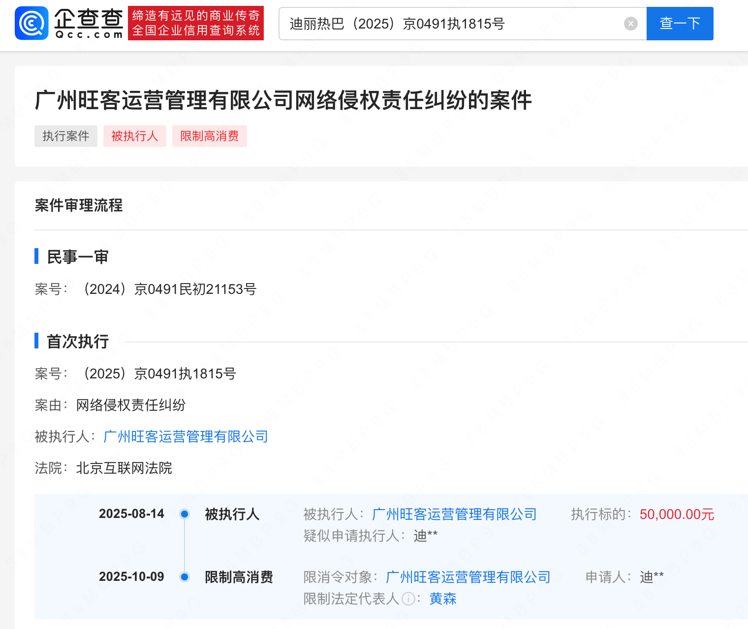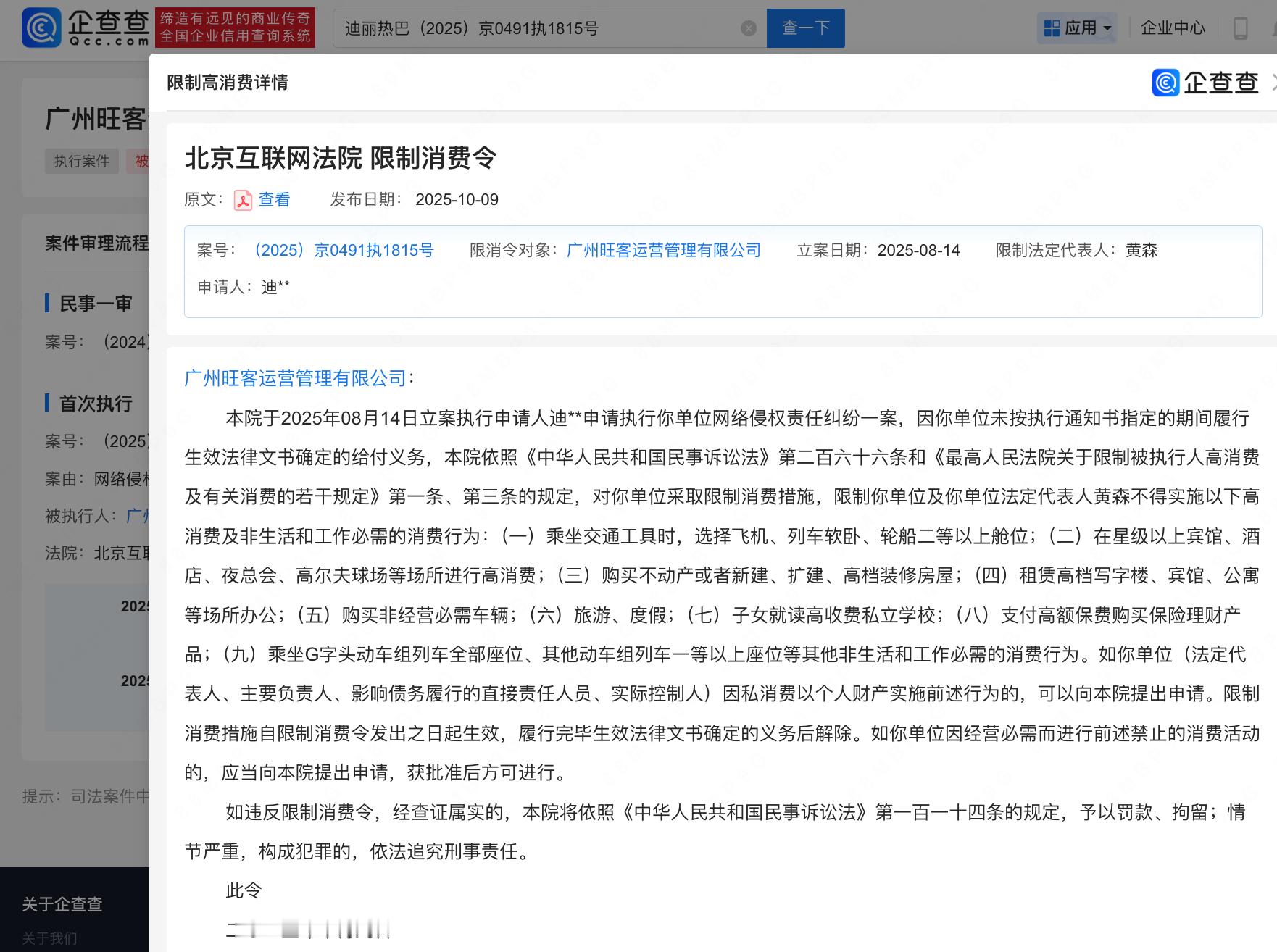 【一公司侵权迪丽热巴被限消】迪丽热巴维权进展企查查APP显示,近日,与广州旺客运营管理有限公司网络侵权责任纠纷新增限制消费令,8月该公司已因此案被强制执行5万元。据悉,该公司旗下有奶茶品牌邓氏阿嬷手作,社交平台显示网友曾晒出迪丽热巴与其相关物料。