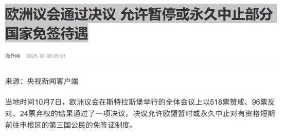 欧洲议会以518票赞成、96票反对、24票弃权的压倒性结果,通过了一项颠覆性的决议,欧盟有权随时暂停或永久取消对数十个国家的免签待遇。 10月7日,欧洲议会在法国斯特拉斯堡的全体会议上,用518票赞成、96票反对、24票弃权的压倒性结果,通过了一项让不少国家都捏把汗的决议——欧盟今后有权随时暂停甚至永久取消对数十个国家的免签待遇。 这消息一出来立刻引发震动,要知道过去拿着美国、以色列、澳大利亚护照的人,随便买张机票就能踏上申根区的土地,压根不用跟签证官打交道,可往后说不定就得老老实实去排队递材料,等着被严格审查了。 更让人关注的是,这次的新规玩了个“精准打击”的花样,不是一竿子打翻一船人。要是欧盟觉得哪个国家“违规”了,哪怕普通游客的免签还能暂时保住,也能单独把这个国家的政府官员的免签特权给撤了,等于直接断了这些官员轻松去欧洲的路子。 而且这暂停还不是一上来就永久的,一开始可能只是暂时的警告,但要是对方不纠正那些让欧盟不满的问题,那暂时的暂停就会变成永久取消,一点转圜的余地都不留。 客观来看,欧盟搞出这么个颠覆性的决议,不是脑子一热的决定。这两年欧洲内部的极右翼势力一直在上升,不少国家的民众对人员自由流动的意见越来越大,各国政府为了拉选票,不得不向这种保守的政治倾向妥协,收紧边境政策成了顺理成章的事。 再者,最近以色列在加沙的行动闹得沸沸扬扬,欧洲民众的抗议一波接一波,这给那些过去对以色列比较友好的欧盟国家政府带来了很大压力,拿签证政策当筹码施压以色列,确实是个挺管用的办法。 还有就是跟美国的关系,这些年“美国优先”的论调让欧美在意识形态上的分歧越来越大,欧盟想借着签证这张牌强化跟美国的博弈,重新定一下欧美关系的调子。 欧盟自己也说了,出台这政策是为了应对“滥用免签旅行”的情况。比如这些年总有不少持免签护照的人跑到申根区,提一些毫无根据的庇护申请,搞得多国移民部门焦头烂额。 要知道以前欧盟想暂停免签可没这么容易,得欧洲委员会要么接成员国提议,要么自己主动决定,先暂时实施,再花时间调查对话,折腾一圈下来才能定,到现在为止也就只取消过瓦努阿图一个国家的免签待遇。可这次的新规等于把权力给简化了,欧盟想动免签的念头时,门槛低了不少。 不过也不是所有人都赞成这个决议,卢森堡首相吕克・弗里登在投票前一小时还特意站出来说话,他说要是长期恢复边境管制,不光会给欧洲的经济添负担,更是对整个欧洲计划和它代表的价值观的倒退。 这话其实说到了不少人的心里,毕竟免签政策搞了这么多年,早就成了欧洲开放的象征,突然说能随便暂停,确实有点背离之前的理念。而且生意人也犯愁,要是美欧之间真的取消免签,跨境谈业务的时间成本和精力成本都会蹭蹭往上涨,小公司说不定都扛不住。 现在欧盟已经放出话了,连具体的“目标”都有了苗头,比如格鲁吉亚要是在10月26日的议会选举里没能完全遵守标准,欧盟就考虑暂时中止跟它的免签制度。但有个关键问题得说清楚,这决议现在只是欧洲议会通过了,还不算彻底生效,按照规矩,得等欧盟理事会和欧洲议会最终确认了才行。要是这一步卡壳,说不定还会有变数。 要是新规真的落地,影响可就不止一点半点。对美国、以色列这些国家的普通人来说,以后去欧洲旅游、探亲、谈生意,都得多一道手续:填申请表、准备资产证明、预约面签,说不定还得等上十天半个月才能拿到签证,遇上旺季排队排到怀疑人生。 而对那些政府官员来说,要是本国被欧盟盯上,想再去欧洲开会、访问可就难了,这等于直接卡了外交沟通的渠道。更有意思的是,免签这事儿从来都是双向的,要是欧盟真敢取消美国的免签,美国说不定也会反过来对欧盟国家下手,到时候两边的人都得遭罪。 现在美、以、澳大利亚这些被点名的国家还没正式回应,但明眼人都能猜到,他们肯定不会坐视不管。美国说不定会拿欧盟企业的市场准入说事儿,以色列也可能在能源合作上给欧洲使绊子。毕竟签证政策从来都不只是“能不能入境”的小事,背后藏着的都是外交博弈和利益交换。 还有个让人琢磨的点,欧盟说的“违规”到底是啥标准?是庇护申请多就算违规,还是跟欧盟在外交上唱反调就算?要是标准不明确,往后欧盟想捏哪个国家的“软柿子”,岂不是都能拿这个决议当借口? 这也是不少国家担心的地方,怕这政策最后变成欧盟随意拿捏别人的工具。不过目前这一切还只是“纸上谈兵”,得等欧盟理事会点头才算数。要是真的生效了,第一个被“开刀”的会是哪个国家? 是跟欧盟闹别扭的以色列,还是态度强硬的美国?普通民众会不会真的被卷进这场外交博弈里?这些都得接着观察。 信息来源:海外网欧洲议会通过决议允许暂停或永久中止部分国家免签待遇2025-10-08