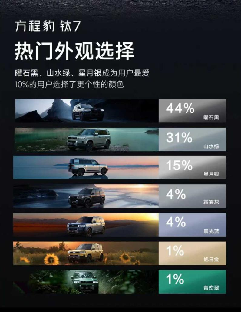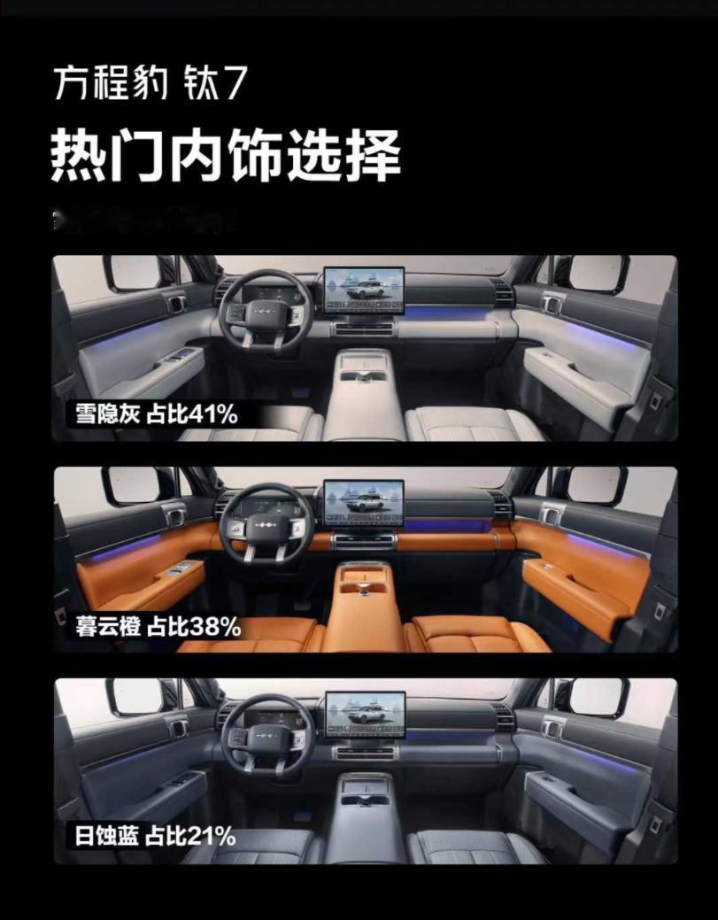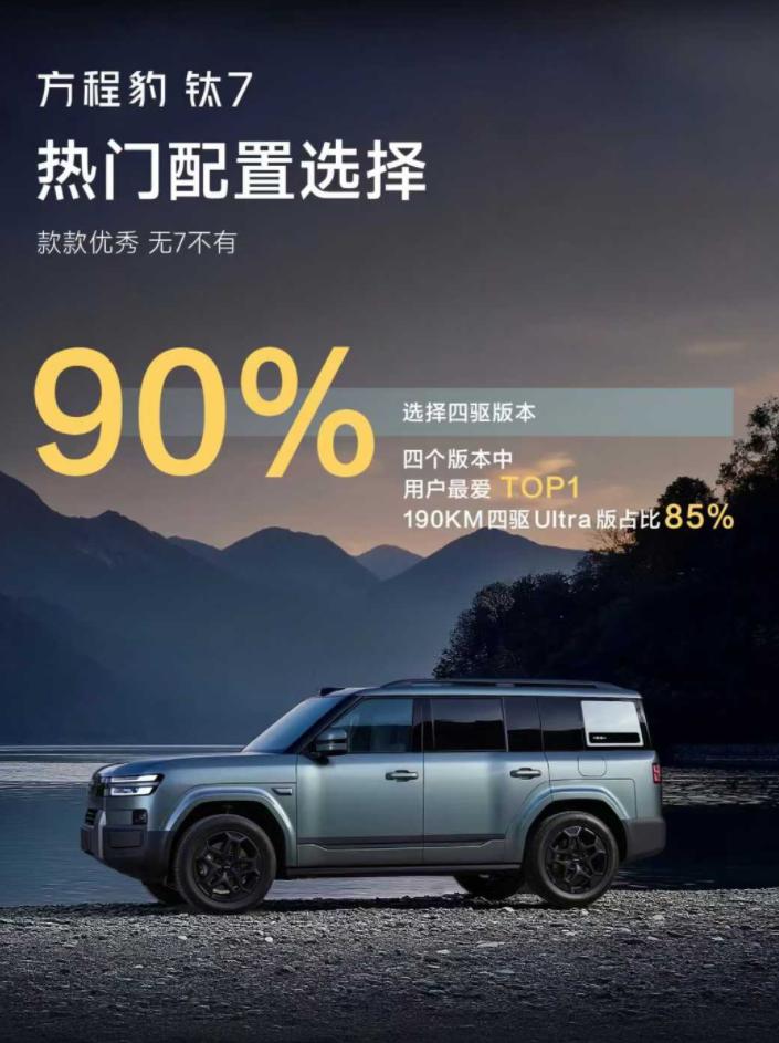 方程豹钛7上市首月交付11674台,20出头拿下四驱顶配,杀伤力还挺强的,车主报告也跟着出炉,咱们来搂两眼,选四驱车型的占9成,黑武士依旧大热,只有的10%用户选择了个性颜色,内饰颜色则基本上是“55开”,大空间是用户青睐的TOP1,问问大豹子的车主,您选择它的理由还有啥,评论区走一波。【来自懂车帝车友圈】