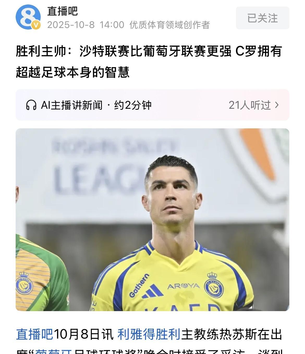 利雅得胜利主帅热苏斯表示:沙特联赛比葡萄牙联赛更强。 为了钱,可以贬损自己国家的联赛。 有球迷评论称:这老头比那些吃大陆饭、赚大陆钱的TD的觉悟高多了。 倒也是,在哪里挣钱,就说哪里的好话,确实比TD分子强多了。正如C罗,混迹于沙特,就说沙特联赛强于葡超联赛。收了TD分子的钱,就打出分裂中国的TD旗子。倒也是收钱办事。