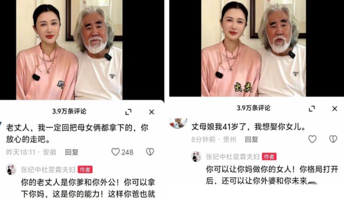 我滴个娘啊!快被大导演张纪中两口子笑晕了! 评论区没眼看! 网友们太有才了,都会走捷径,我咋没想到这点呢!? 按照网友的逻辑,真的没毛病,你张导就可以娶个媳妇比自己小三十多岁,为啥网友不可以啊,万一到了那天真的应验了呢? 网友评论: 在张纪中8岁的时候,发生了一件大事,他老丈人出生了。 本是一段畸形的婚姻,好好藏着过日子没人说你们。却偏偏生怕全世界不知道似的,本来就是有知名度有些影响力。你是在宣传什么?符合中华民族婚姻的道德吗? 其实是他老婆在骂网友,张纪中很少骂,直播的时候也是她老婆在骂。 小杜默默地收集了留言,然后悄悄的回信:说话当真否?等他走了,你可不能食言,要照顾好我们母女。 总共回了1000多条,小杜聪明。 按理说张纪中拍了那么多作品,手里该有35个亿能安度晚年,不至于 这么大年纪了还出没在网上,丢人现眼晚节不保啊。