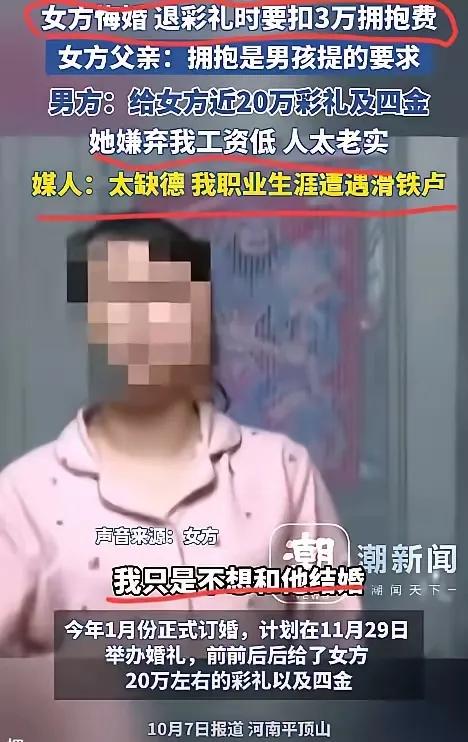 河南彩礼闹剧:3万“拥抱费”? 这波操作把相亲圈的底裤都扒没了! 咱就说现在的相亲市场有多离谱! 河南一对情侣谈崩了,女方退彩礼时居然张口要3万“拥抱费”,这事儿直接从本地火到全国,看完真让人血压飙升。 男方老实、工资不高就成了被嫌弃的理由?更绝的是媒婆,干这行这么多年撮合1000多对,愣是没见过这么奇葩的,直言这家人“太缺德”,自己职业生涯都遭遇“滑铁卢”。 别觉得这只是小事,相亲圈就那么大,媒婆们都有自己的群,互相知根知底。现在这姑娘被群里拉黑,往后在当地想找相亲对象,基本就是没门儿。说真的,结婚本是双向奔赴的事儿,就算不成也该留几分体面,拿“拥抱费”当借口,不仅丢了人品,还断了自家姑娘的路,这算盘打得也太精,精到没了底线。 其实这事儿也给所有人提了个醒:感情里最忌讳的就是算计,尤其是把彩礼、相处细节都明码标价,最后只会落得个两边不讨好。大家身边有没有遇到过类似的奇葩相亲事儿?评论区聊聊,看看谁的经历更让人大开眼界!