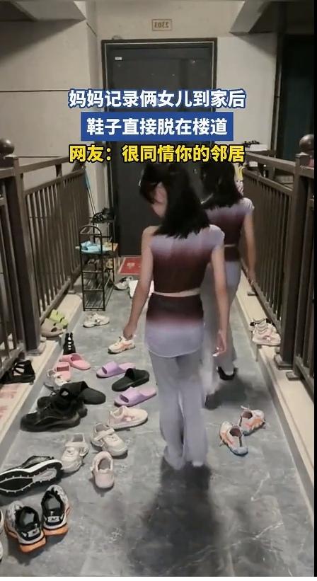 这习惯可不太好呀!一博主发视频记录俩女儿的生活日常,视频中两个女儿从外面回到家后,直接将鞋子脱在楼道里。整个楼道摆满了鞋子,东一个西一个,也没有按秩序摆放。那场面看着就很混乱。 再仔细一看,楼道里不止有孩子的鞋子,也有家长的鞋子。所以说,这不是故意为之,而是她们家的习惯就是这个样子。 网友看到后评论说,如果是一梯一户的还好,不然的话,真的很同情你的邻居。 还有的网友说,真的是不以为耻反以为荣!这不是故意发出来网暴自己吗? 真的不敢想象夏天会怎么样?是不是整个楼道弥漫着臭气的味道呢?又或者说整个楼道苍蝇满天飞呢? 你们家这样做就不怕邻居投诉你们吗?为了自己的私欲,损害了整个楼层的利益。 为什么就不能把自家的鞋子放到屋子里呢?在屋子里做一个鞋柜,这不是挺好的吗?这样做既避免了邻里矛盾,也给孩子养成一个正确的生活习惯。何乐而不为呢? 大家说,是不是这个理呢?话说大家有没有遇到这种邻居呢?你们是如何处理的呢?欢迎大家评论区讨论留言。