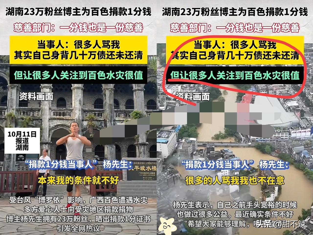 湖南23万粉丝博主杨守田为百色捐款1分钱,被网友们一边倒的骂惨了。 他本人也回应了,他捐一分钱就是故意的,就想让更多人注意到广西的灾情! 这话还真没说错,要是他悄悄捐十万,估计没几个人知道这事,更别提关注灾区了。 有人说他是博流量、蹭热度,可反过来想,他宁愿自己扛着网暴、背着骂名,也把广西水灾的话题带火了,这不也是在为灾区出力吗? 而且慈善部门都出来说,一分钱也是份善意,总比那些天天盯着无关八卦、连句关心都没有的强吧? 其实捐多捐少从来不是慈善的标尺,能不能真正帮到灾区才是关键! 他用这种“惹争议”的方式,让更多人看见百色的需要,反而比默默捐款更有传播力! 无论多少都是一份心意,我们都很感谢的你,希望更多的大v能够关注到广西水灾!
