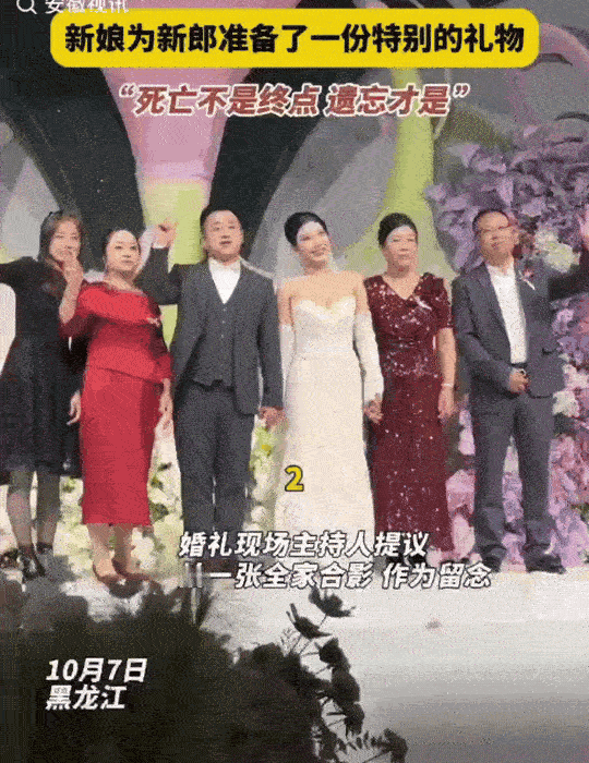 “泪目!”黑龙江,一场婚礼进行到了拍全家福。新郎因为父亲去世非常难过,新娘拿出一