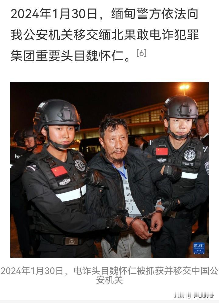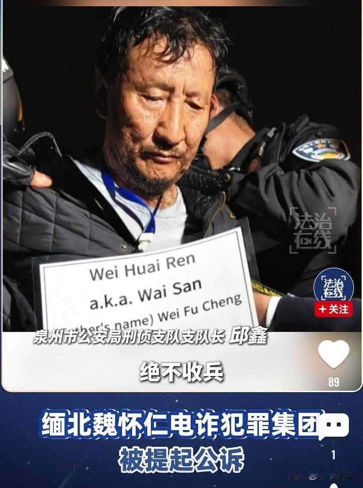 天网恢恢,疏而不漏!终于看到国家对缅北果敢“四大家族”的魏家开始审判了!魏家,凭一个边防营的兵力,就想对抗中国? 其实,任你有再多的钱,甚至有武装保护,只要坑害中国人民、与中国人民为敌的,中国🇨🇳正义的力量是虽远必诛! 国庆节前,缅北果敢明家犯罪集团案一审判决,对明国平、明珍珍、周卫昌等11名被告人判处死刑;另外还有其他人的相应判决。 此后,大家就一直期待着对缅甸果敢的白家、魏家的审判进展。 因为,缅北果敢的白家,是在“四大家族”后面的所谓“第五家族”,要说起犯罪集团的势力,还是“白魏二刘”的四大家族更大。 其中,白家势力最大,而魏家也不简单,实力第二,其军方实力却是四大家族中最强的。 本来,魏家的掌门人是魏超仁。2023年12月,有媒体称魏超仁已病故。 于是,魏怀仁,又名魏三,魏超仁的弟弟,成了魏家实际的掌舵者。他控制着缅甸政府军果敢边防营,是四大家族中唯一掌控正规军权的势力。 魏家早期以贩毒、博彩起家,后与电诈集团合作牟取暴利,并利用家族武装为电诈集团保驾护航。 魏家的产业——亨利集团经营很多项目,涉猎赌场、电诈、房地产业等等。明面上,他们经营着东南亚酒店娱乐旅游、地产开发、矿产开发、黄金珠宝等生意,暗地里,他们经营的是博彩、电信诈骗等业务,还把电诈园区的业务扩展到了柬埔寨、泰国。果敢老街有名的新锦江赌场也是亨利集团的旗下产业。 电诈集团把我国大批公民骗出国境,控制他们的人身自由,对他们进行殴打,甚至直接杀害。电诈的对象、以及网络赌博集团找的潜在客户又是我国的普通百姓,多少人因为电诈、网络赌博而倾家荡产、甚至家破人亡…… 针对电诈、赌博集团对我国人民的严重危害,国家出手了。2023年11月,目标是白家。12月,魏家也成为公开通缉的犯罪集团之一,福建省泉州市公安局对魏怀仁进行公开悬赏通缉。 在这之前,2023年10月,魏清涛(魏超仁的长子,魏怀仁的侄子)涉缅北电诈被我国警方缉拿后,录制忏悔视频,承认亨利集团从事诈骗的事实。同年11月,魏清涛再次录制视频要求家族杜绝电信诈骗,并喊话“不要再抱有任何幻想,把中国人交回中国”。 可惜,或许在缅北果敢过惯了土皇帝的生活,已经不知道“天上有天,人外有人”,魏怀仁没有及时停手,据说,他还意图带兵去迎回侄子魏清涛,还是在多方的劝阻下才作罢。 仅在通缉令下达的两个月后,2024年1月30日,魏怀仁做为缅甸警方依法向我公安机关移交的6名缅北果敢电诈犯罪集团重要头目之一,被押解回国。 截至2024年底,魏家在内的缅北果敢“四大家族”犯罪集团已被彻底摧毁。 今天在央视新闻上看到的最新进展,2025年10月,魏怀仁等3人被检察机关以涉嫌诈骗罪、故意杀人罪、组织他人偷越国(边)境罪、敲诈勒索罪等向福建省泉州市中级人民法提起公诉。 至于另外2人是谁,从中还未看到。魏家的其他几个重要犯罪分子中,魏怀仁的儿子魏青松、侄女魏榕,之前据说在逃,也不知道此次审判时,抓回来未。假如还未抓回,国家对这样严重侵害我国人民生命财产安全的犯罪分子,必将尽全力追捕到案! 要知道,天网恢恢,疏而不漏。与中国人民为敌的,中国🇨🇳正义的力量是虽远必诛!