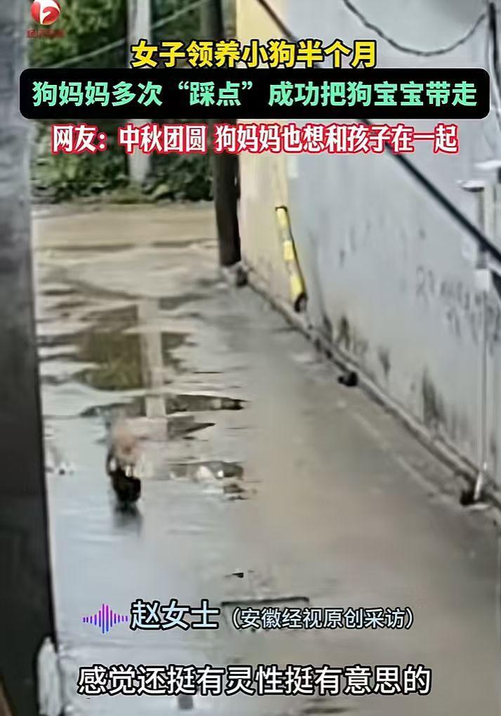 “万物皆有灵!”10月10日,山东菏泽,一女子领养小奶狗半个月,中秋节前狗妈妈竟然多次“踩点”将小狗带走,过完中秋节又将小狗送回女子身边,网友:狗妈妈也想和孩子在一起过节! 狗狗是种十分聪明的动物,它们通人性,常常会做出一些令人意想不到的类人行为,让人为之动容,就好像有着和人类一样充沛的情感。 一女子半个月前在村里领养了一只小奶狗,在那之后,女子家门口的监控中多次出现了狗妈妈“鬼鬼祟祟”的身影,女子以为狗妈妈是舍不得孩子的,也没有放在心上。 没想到,中秋节当天狗妈妈竟然直接将小奶狗给领走了!时隔半个月,小狗还记得妈妈,见到妈妈的那一刻它激动到尾巴都快摇到天上去了,狗妈妈不停回头催促,小狗迈着小碎步跟着狗妈妈向远处跑去。 女子发现小狗不见了,急忙查看大门的监控,发现小狗被狗妈妈带走,她这才意识到此前狗妈妈是来她家门口“踩点”的,为的就是接自己孩子回家。 中秋节过后,狗妈妈又亲自将小狗送回到女子身边,女子觉得这对狗狗母子十分有趣,便将这段神奇的经历分享到了网上。 不少网友认为狗妈妈也想和自己的孩子一起过中秋节,不得不说,万物皆有灵性,动物的情感一点不比人类少! 信息来源:《女子领养小狗半个月,狗妈妈多次“踩点”成功把狗宝宝带走》