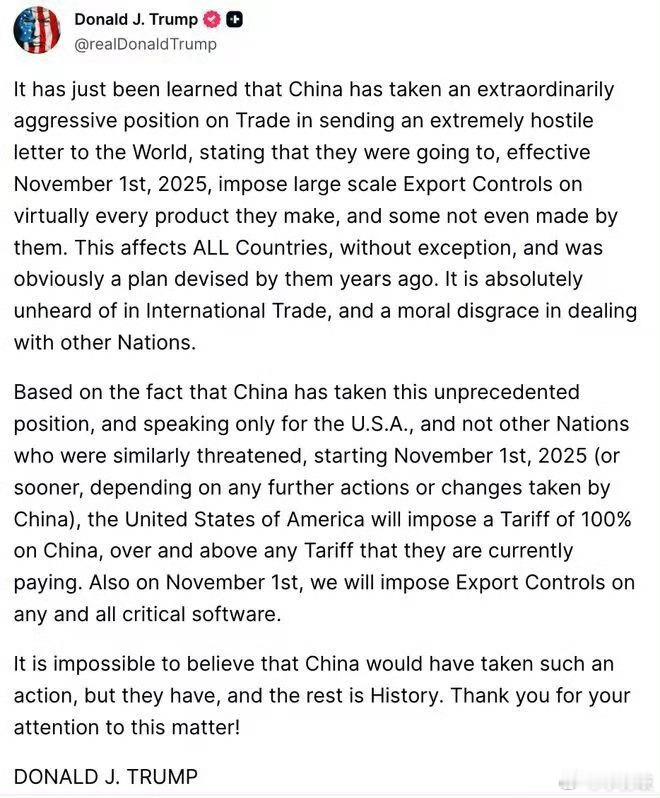 美国总统特朗普周五通过社交媒体Truth Social宣布,将从11月1日起对中国进口商品征收100%关税,并禁止“任何关键软件”出口至中国,作为对中国限制出口稀土的报复。特朗普宣称,“每当他们祭出一种手段,我们就会做出双倍回应。”