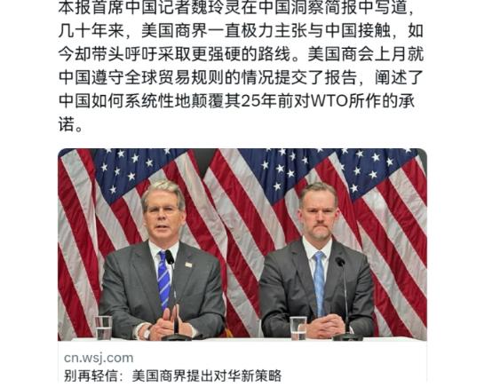 美国商会对我们非常愤怒!美国商会表示,必须对中国来硬的,不能轻信中国了! 美国商会这阵子跳得特别高,借着华尔街日报的报道喊着 “要对中国来硬的”,还拿 9 月那份报告说事儿,声称中国 “系统性颠覆” WTO 承诺,把市场改革抛到脑后,靠激进产业政策和强制技术转让搞发展。 可真要扒开这层说辞看内里,哪是什么 “不信中国”,分明是他们的垄断蛋糕被碰了,急得跳脚罢了。 先说说所谓的 “违背 WTO 承诺”,这纯属睁着眼睛说瞎话。中国 2001 年加入 WTO 时承诺的平均关税是 9.8%,这些年实打实降到了 7.4%,比当初答应的还低了近两个百分点,这叫 “抛却承诺”? 再看市场开放,外资准入负面清单从 2018 年的 48 条缩减到现在的 31 条,制造业早就基本全面开放,连汽车、金融这些以前的 “禁区” 都在逐步放开。 就拿特斯拉来说,上海超级工厂是中国首个外商独资整车厂,人家主动把核心生产技术搬过来,不是因为 “强制”,是看中了中国的市场和配套能力 —— 要是真有强制技术转让,美国自己的贸易代表办公室年年出报告,怎么从来拿不出实锤证据? 再说 “激进产业政策”,这话说出来简直双标到没边。美国自己去年刚砸了 520 亿美元搞芯片法案,今年又加码补贴新能源产业,连买美国产电动车都给消费者发钱,这难道不是 “国家干预”? 欧洲也在搞绿色新政,砸钱扶持光伏和风电。合着只有美国和西方能靠政府补贴抢市场,中国搞点产业升级的规划,比如支持新能源、高端制造,就成了 “激进”? 要知道中国的产业政策从来不是关门造车,而是跟着市场走 —— 就像新能源汽车,是先有市场需求,才有政策配套扶持,现在全球每卖出三辆新能源车就有一辆是中国造,这靠的是技术和性价比,不是什么 “不正当手段”。 美国商会真正愤怒的,根本不是什么 “规则”,而是中国不再甘心只做低端加工厂,开始在高端领域跟他们抢饭碗了。 二十多年前,中国给他们做衣服、造玩具,美国企业赚得盆满钵满,那时候怎么不说 “国家干预”?现在中国能造芯片、搞 5G、卖新能源汽车了,能跟他们在全球市场上硬碰硬竞争了,就立马扣上 “颠覆承诺” 的帽子。 说白了,他们想要的不是 “公平贸易”,是 “中国永远当配角” 的垄断格局。 更可笑的是,美国自己才是 WTO 规则的破坏者。这些年动辄搞单边制裁,把华为等中国企业列入实体清单,禁止芯片出口,这哪点符合 WTO 的非歧视原则? 疫情期间搞疫苗垄断,不顾其他国家死活,怎么不见美国商会出来说句公道话? 现在倒好,自己不守规矩,反倒指责守规矩的人 “不可信”,这逻辑简直强盗到家了。 美国商会喊着 “来硬的”,本质上是想靠政治压力逼中国让步,让中国放弃产业升级,继续给他们当廉价市场和加工厂。 可中国早就不是二十多年前的样子了,既然我们按规则办事还被泼脏水,那更得把自己的产业做硬、市场做稳。 毕竟真金不怕火炼,美国商会的愤怒越凶,越说明中国走的路是对的 —— 靠自己的本事搞发展,履行承诺但不任人拿捏,这才是真正的底气。他们想靠 “硬手段” 压垮中国?怕是打错了算盘。