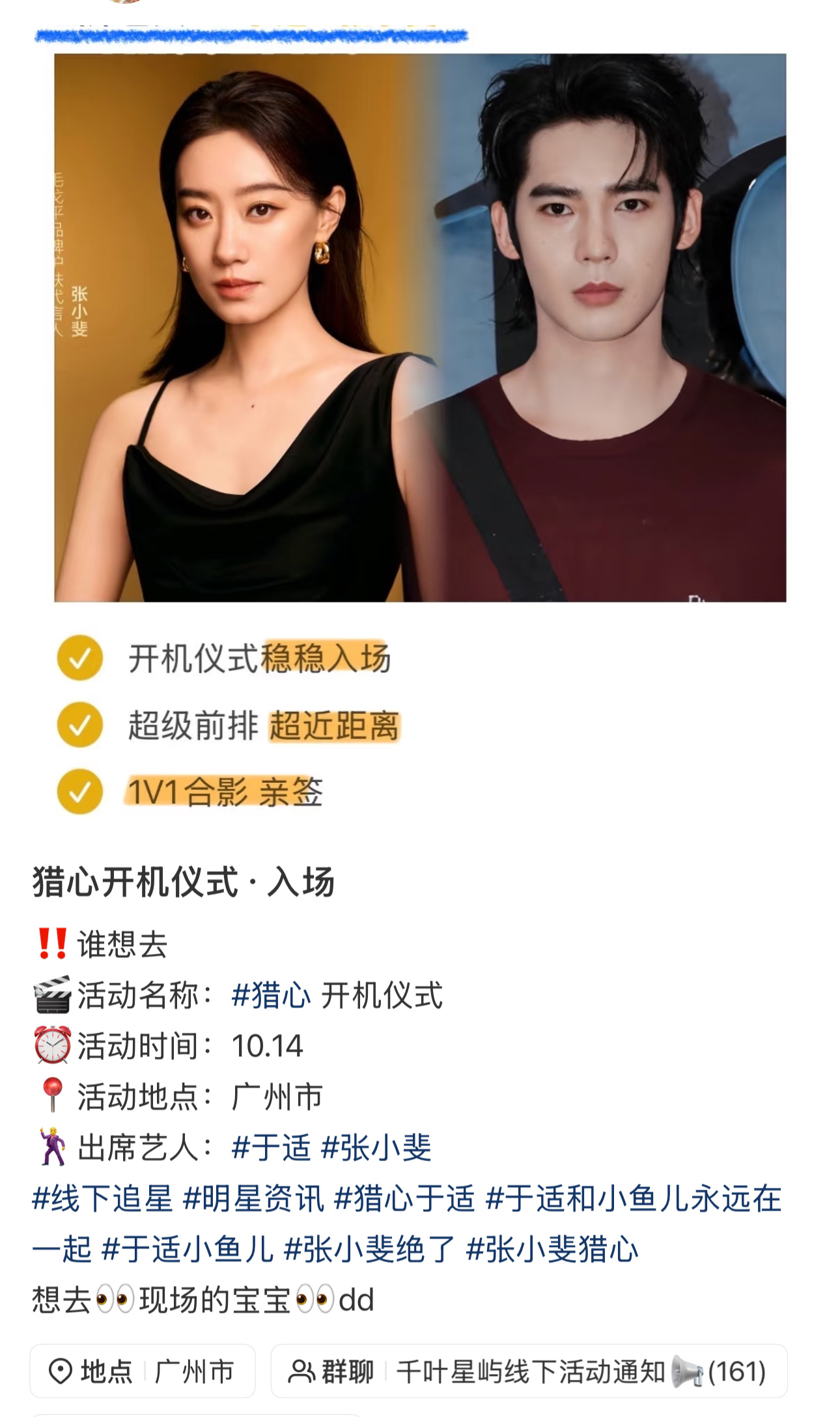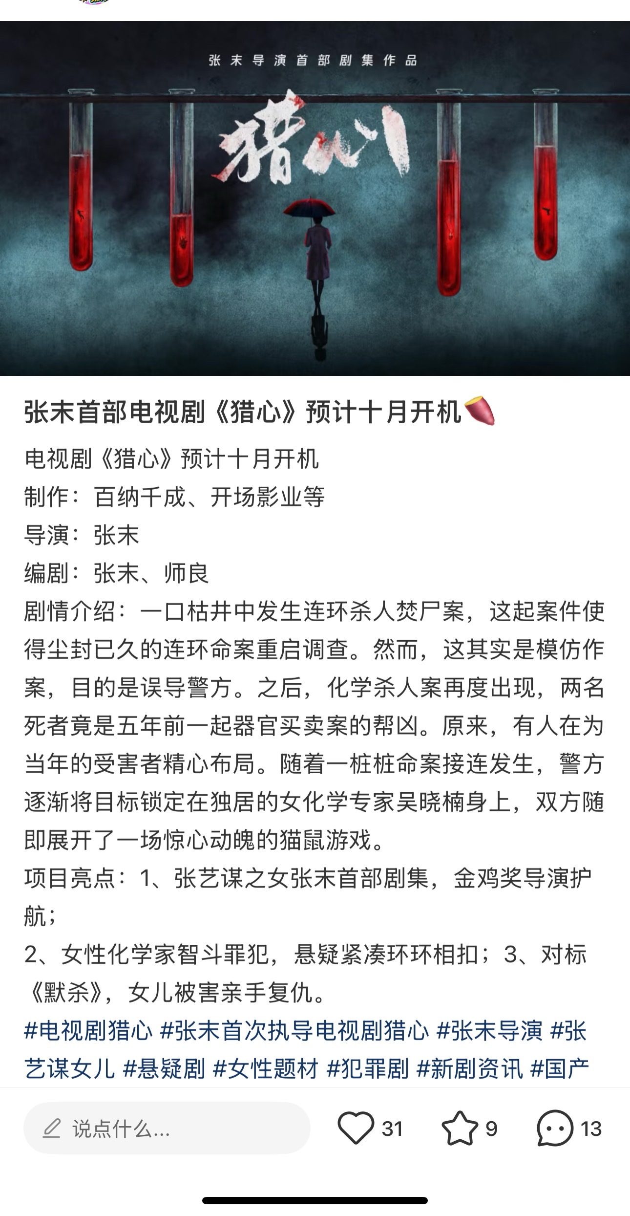 猎心是真的诶!张小斐于适合作,14号开机,斐已经出发了!张末导演(张艺谋女儿)湖