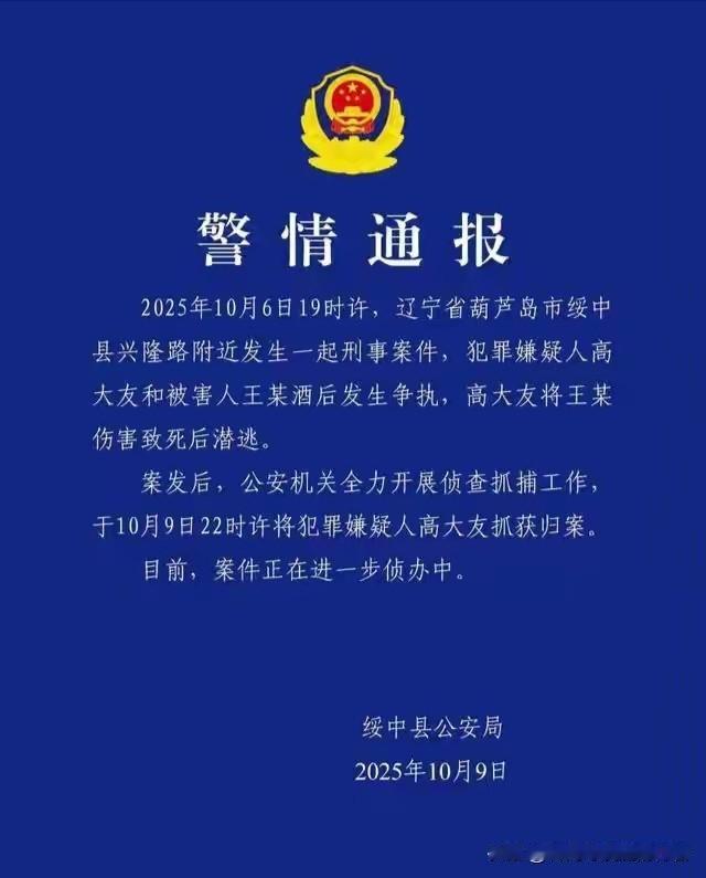喝酒喝出一条命案来,估计高大友喝得这杯酒,将是人生最后一杯酒吧。 辽宁绥中县这起案子,警方悬赏6万征集线索追凶,可见国庆中秋双节出了命案,是多么重大的事件,经过警方三天三夜的不断追踪,最终抓获了嫌犯高大友。 犯罪动机居然是因为喝酒,真是应了那句话,喝酒前,还是个人,喝酒后就不是个人。酒逢知己千杯少,话不投机半句多。这两人喝酒前是朋友,话不投机,还要硬聊。 真是祸从口出,不知哪句话戳中了高大友的痛点,朋友瞬间翻脸变仇人,从此阴阳相隔。 都说7不害人8不害人9(酒)害人。 喝酒还是不要贪杯,小酌怡情,大酌伤身,不是伤自己,就是伤别人。 辽宁绥中杀人案 秦皇岛伤人案 锦州命案 7.26命案 东北饭店反杀 雪松案 郝 宇反杀案 职场酒桌杀人 绥中刑事案件 绥中案件 辽宁绥中刑案 绥中大案 辽宁绥中案件 命案标准 绥中刑案 (相关内容取材于网络)绥中刑事案件 绥中案件 辽宁绥中刑案 绥中大案 辽宁绥中案件 命案标准 绥中刑案