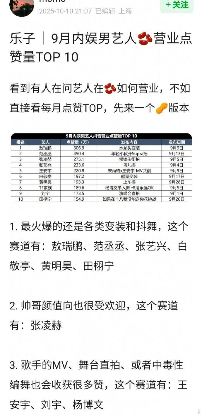 9月内娱男艺人🫘营业点赞量TOP 10:敖瑞鹏、范丞丞、张艺兴、白敬亭、黄明昊、田栩宁、张凌赫、王安宇、刘宇、杨博文