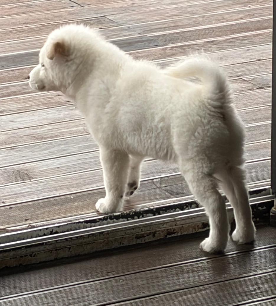 刚才回来路上,有只小白狗一直跟着我。我看它挺干净的,心里还嘀咕:这应该不是流浪狗