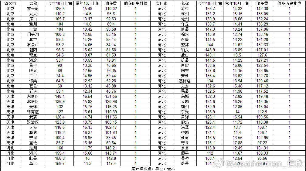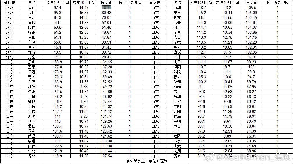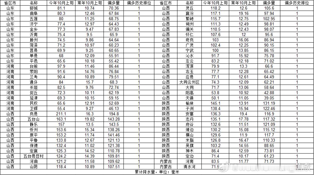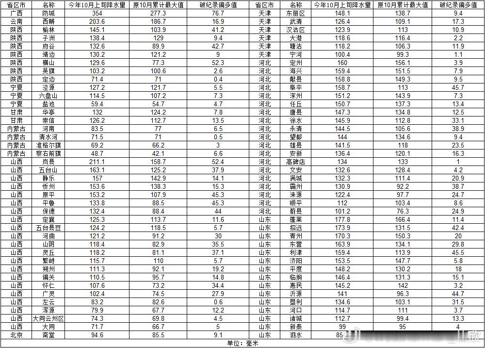 全国一共有247站(大约10%站点)打破10月上旬降水量纪录,比如北京、天津、华北沧州、廊坊、山东烟台、德州、青岛、其中有80站甚至均已经打破10月全月最多降水量纪录,比如广西防城、山西大同、忻州、山东东营。