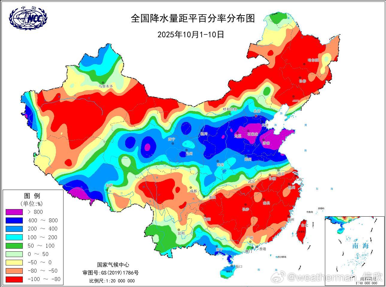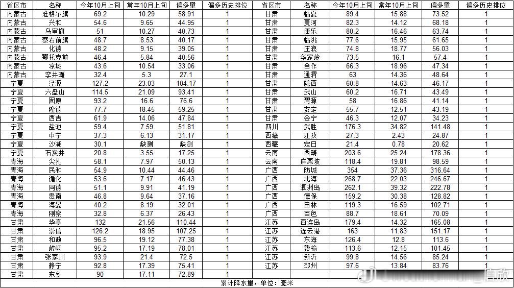 预计10月中旬,西北地区东部、华北南部、黄淮、江汉、西南地区及华南南部等地累计降水量有30~70毫米,其中陕西南部、湖北西部、四川东北部、重庆等地的部分地区100~150毫米,局地200毫米以上;上述大部地区降雨量较常年同期偏多5~8成,部分地区偏多1倍以上。