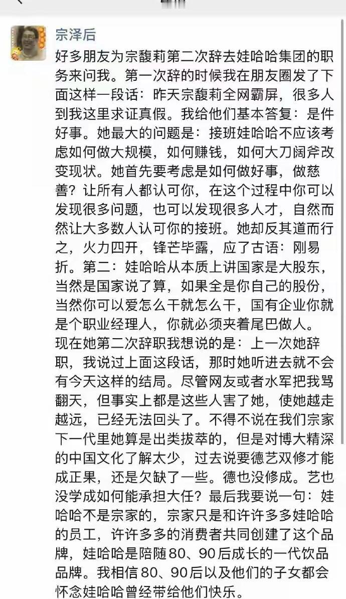 如愿以偿,宗泽后终于把宗馥莉熬走了,他有机会接手娃哈哈吗? 万万想不到,宗馥莉离开娃哈哈最开心的不是杜建英和孩子们而是他! 宗泽后不知道的人以为他是宗馥莉的“仇人”而不是叔叔。 他说宗馥莉第一次辞职的时候,他就认为是好事,因为他认为宗馥莉大刀阔斧开改不可取。 他似乎认为自己比宗馥莉更懂得如何经营娃哈哈,毕竟他年纪大,资历老,还有经验。