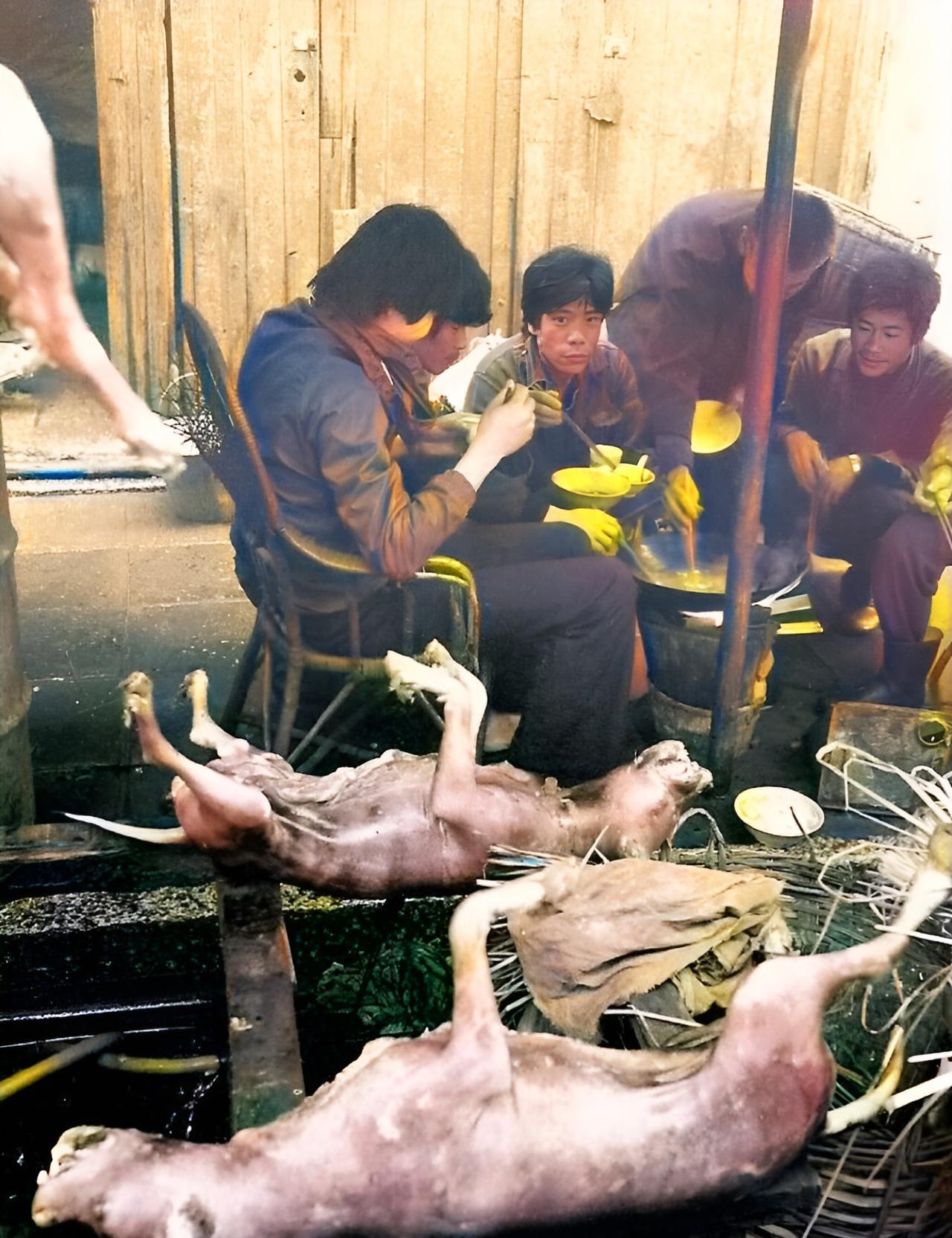 这是1983年几名年轻的潮男围在一起吃饭。几个人就在外面支起一口锅,把食物放在锅里,一边煮一边吃一边说一边笑,快活又热闹。每个人都吃得有滋有味。他们到底吃了什么美味佳肴不得而知,但他们旁边这两只已经被扒了皮四脚朝天的动物引起别人的眼球。两只动物已经扒光了皮毛,好似又被烤了。因此,它们张着大口,四脚僵硬地朝天。 许多人认为这几名年轻人锅里正是煮着这种动物。由于动物被处理的面目全非,许多人已经难以认出这种动物。可是,也有人认为这应该就是狗子。许多地方认为看家狗算一口所以很少吃狗肉。但也有许多地方有吃狗肉的传统。